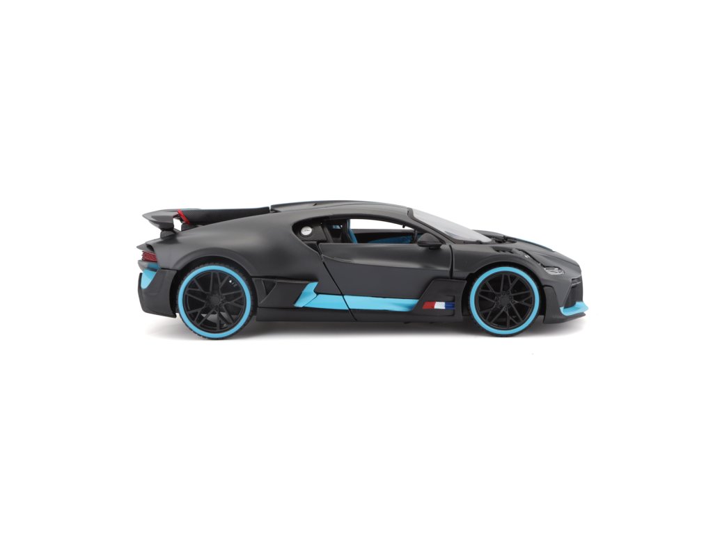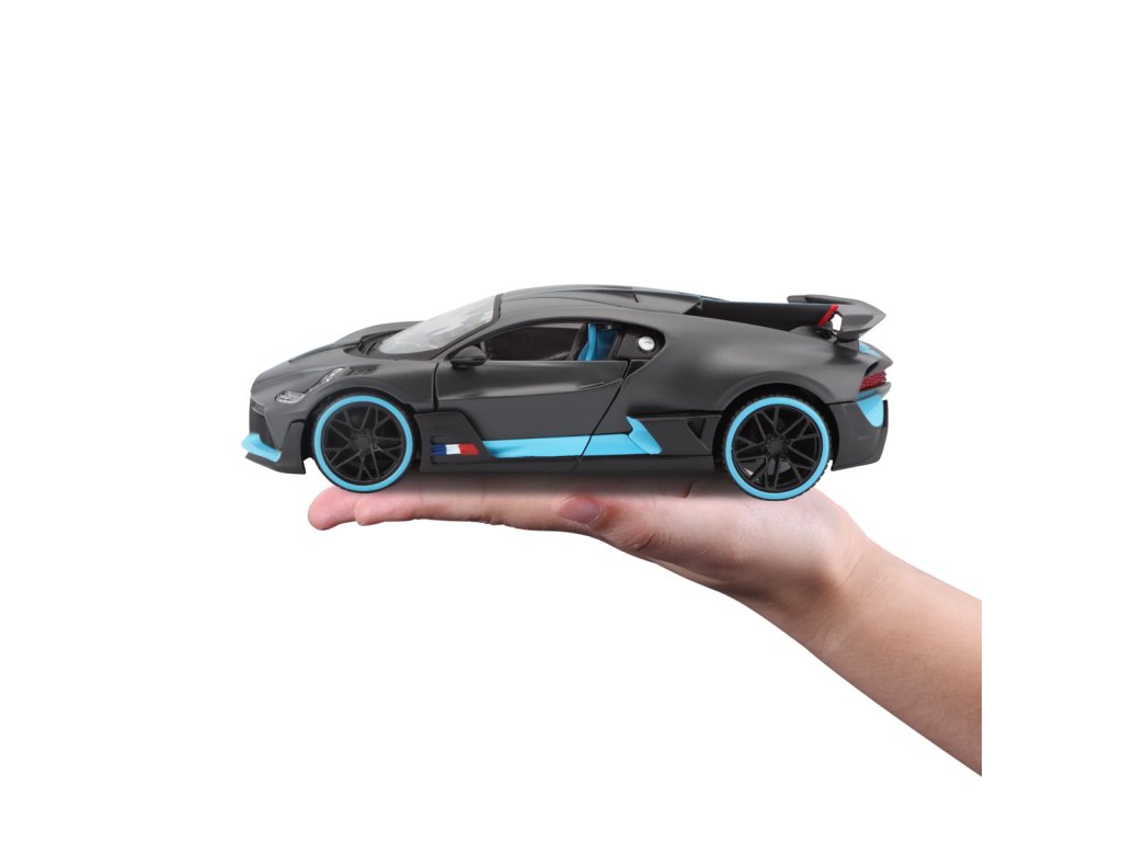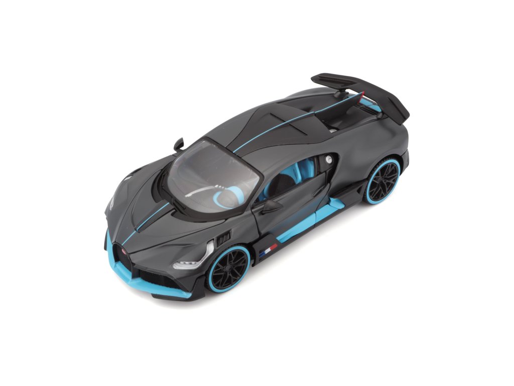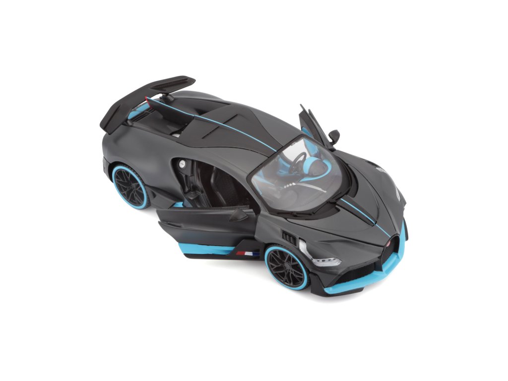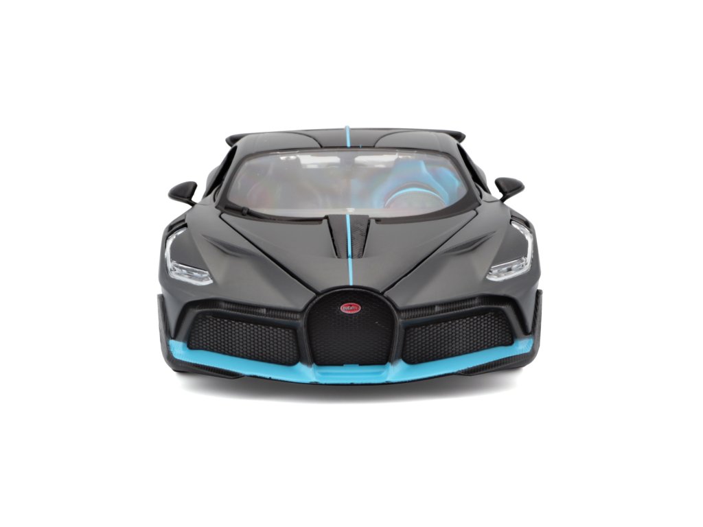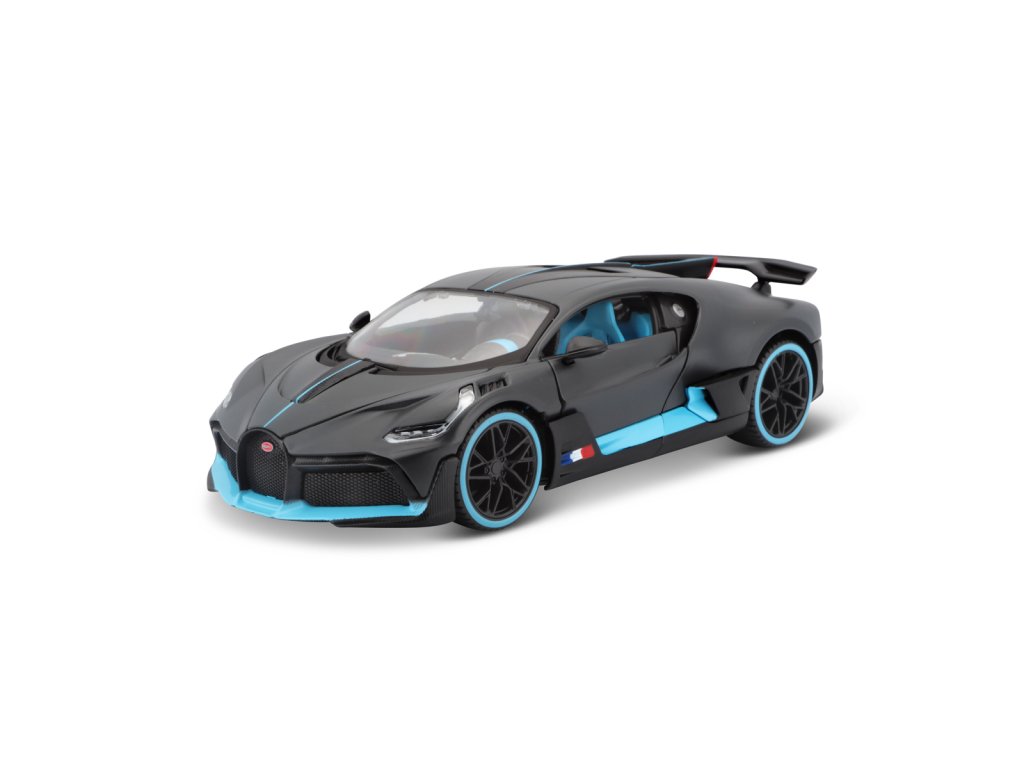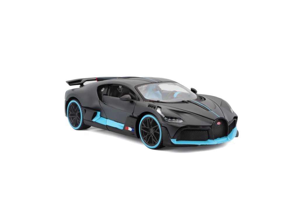 Bugatti Divo. Divo je nejlépe ovladatelný a nejdynamičtější vůz, jaký kdy Bugatti vyrobilo – pocta 110. výročí. Kovový model s plastovými doplňky v měřítku 1:24. Rozměry: 22,9x10,5x11,4cm. Věk: 3+