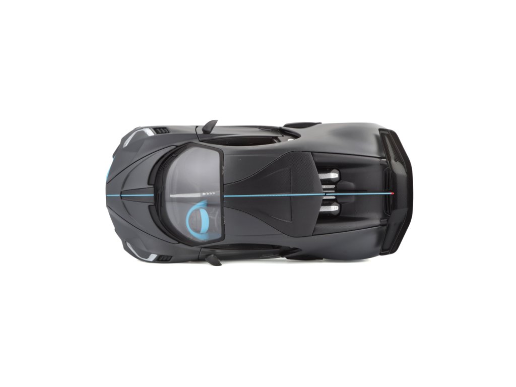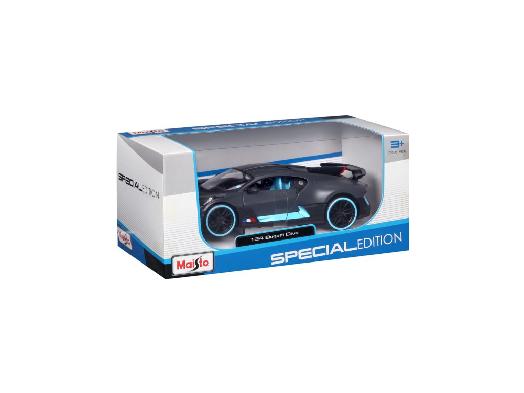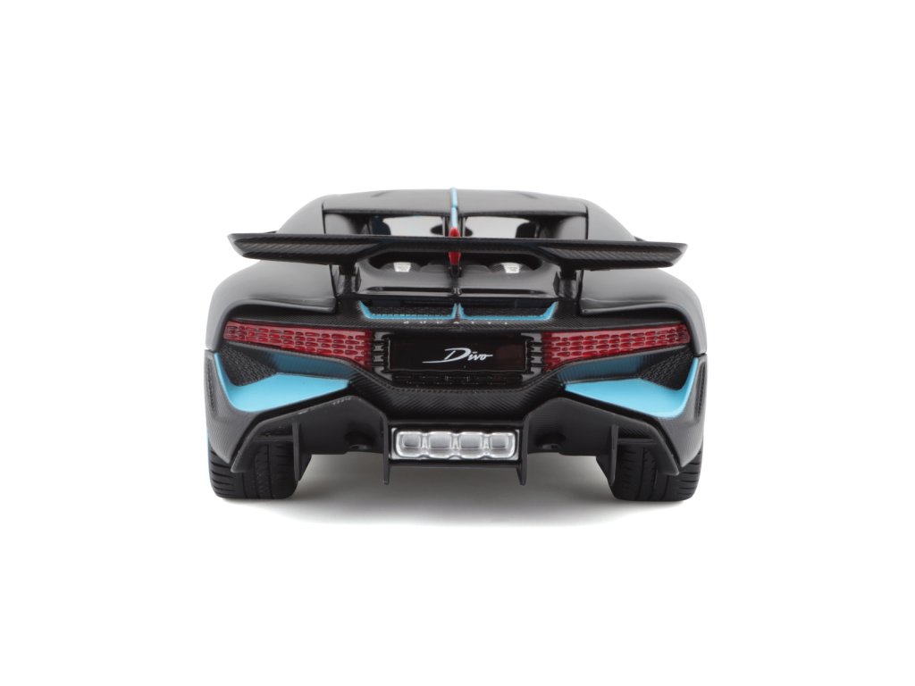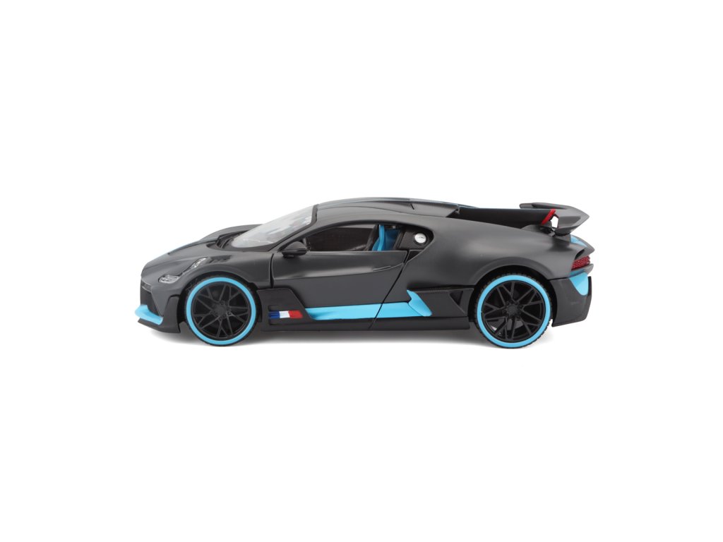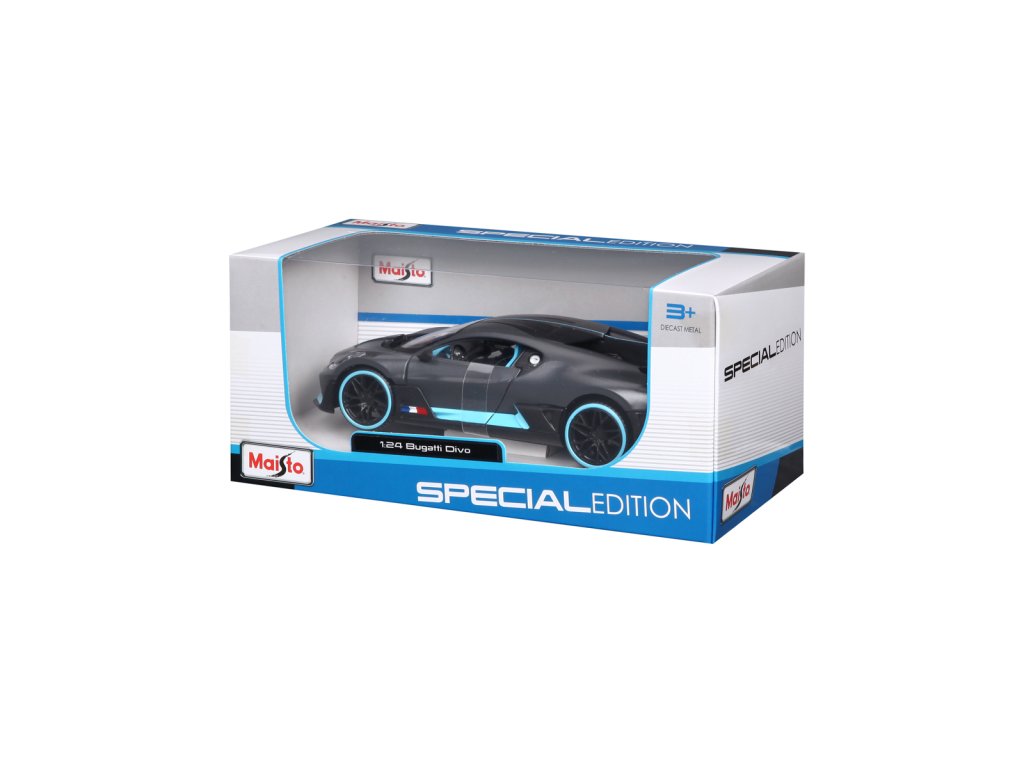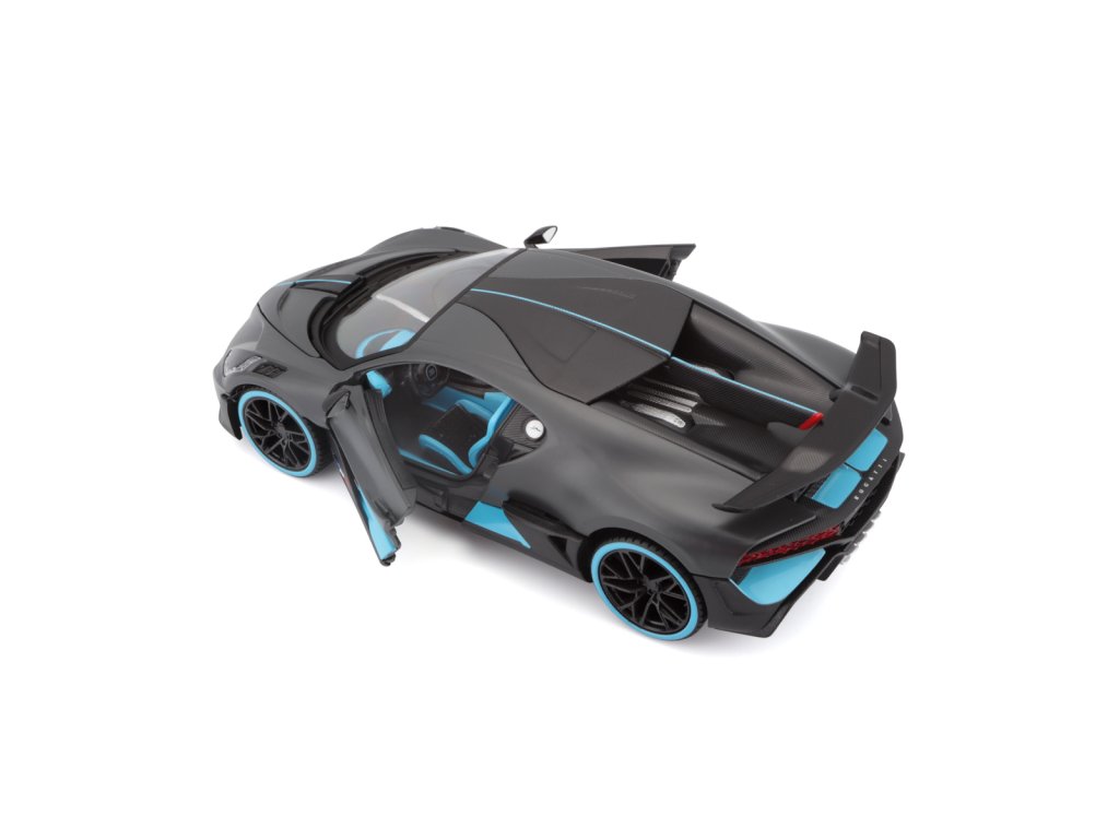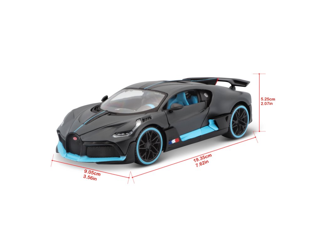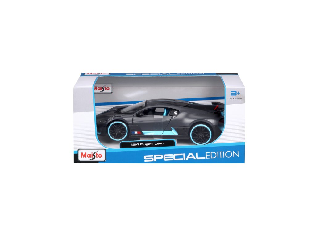 Bugatti Divo. Divo je nejlépe ovladatelný a nejdynamičtější vůz, jaký kdy Bugatti vyrobilo – pocta 110. výročí. Kovový model s plastovými doplňky v měřítku 1:24. Rozměry: 22,9x10,5x11,4cm. Věk: 3+