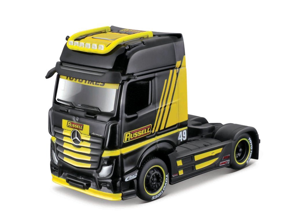 Mercedes-Benz Actros 1851, černo-žlutá. Zcela nové kovové modely tracků s plastovými doplňky. Modely mají gumová kolečka, otevírání přední kapoty, detailní provedení interierů, včetně výrazného barevného provedení, které jim umožňuje vyniknout od ostatních modelů. Balení: 16,45x 8,25x 7,6cm. Věk: 3+