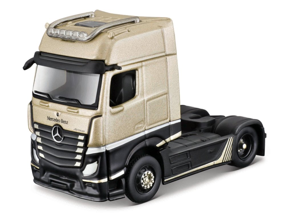 Mercedes-Benz Actros 1851, zlato-černá. Zcela nové kovové modely tracků s plastovými doplňky. Modely mají gumová kolečka, otevírání přední kapoty, detailní provedení interierů, včetně výrazného barevného provedení, které jim umožňuje vyniknout od ostatních modelů. Balení: 16,45x 8,25x 7,6cm. Věk: 3+