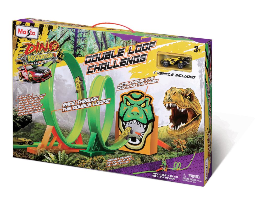 Maisto Dino Adventure Double Loop Challenge – závodní dráha s autíčkem zaručuje dokonalou zábavu. Pestrobarevná autodráha je plná dobrodružství. Po výjezdu autíčka ze startovní brány projede dvěma smyčkami, proletí ústy T-rexe, přes rampu až do cílové rovinky. Součástí sady je arch se samolepkami. Vhodné pro děti od 3 let. Celková délka dráhy je 4 m. Rozměry balení: 33x 50,8 x 7,62 cm.
