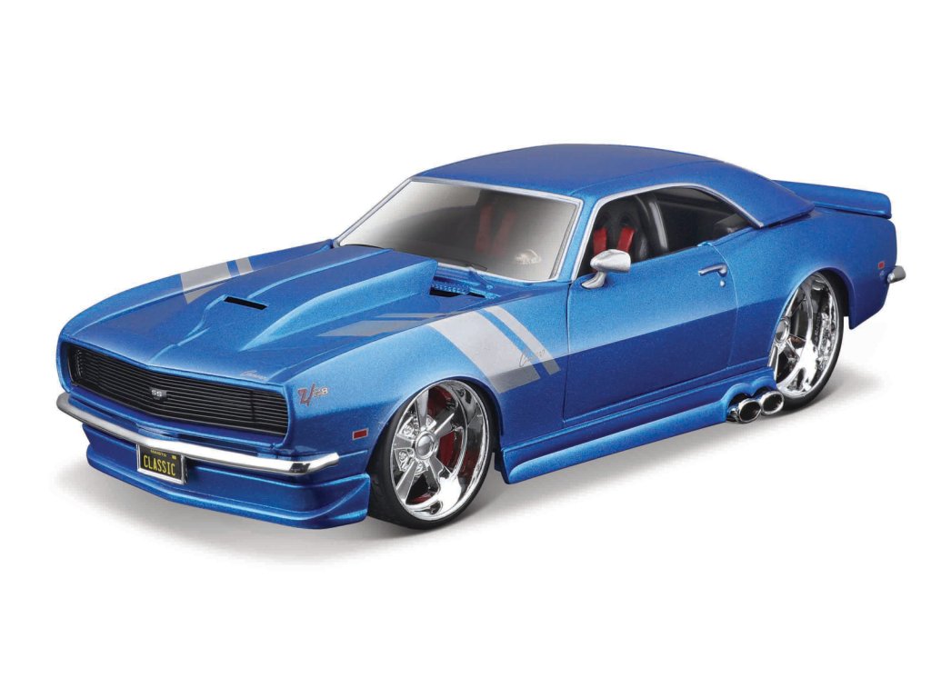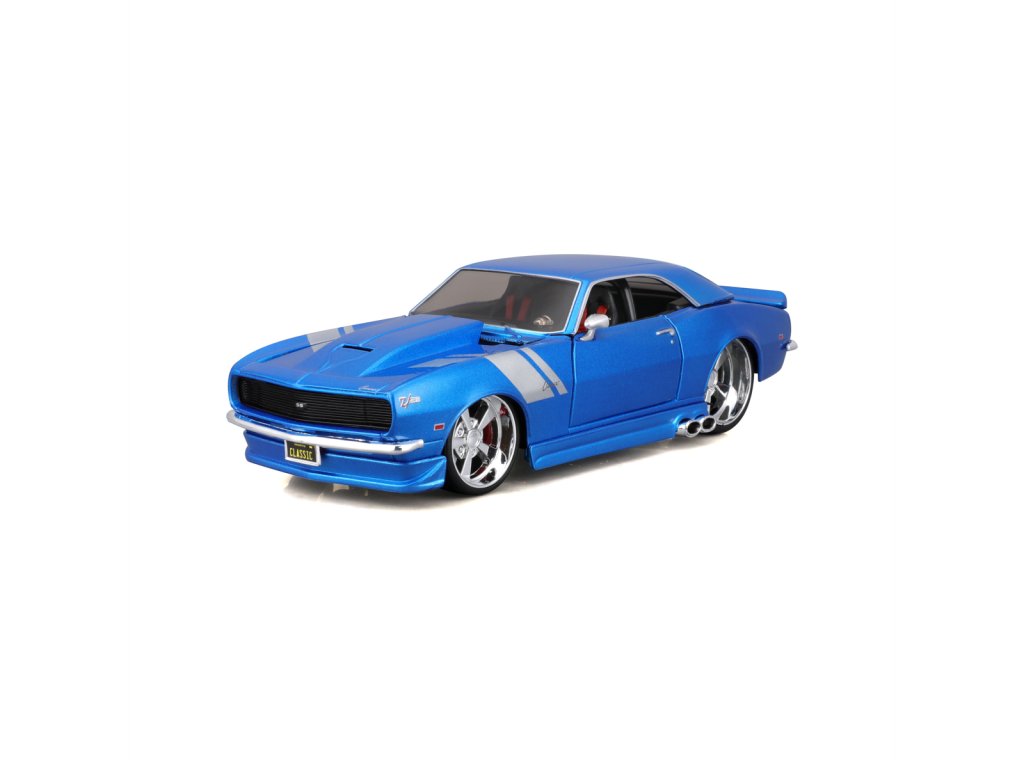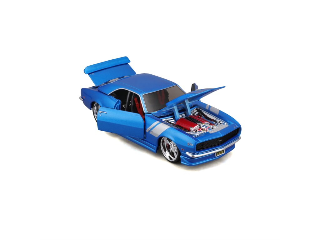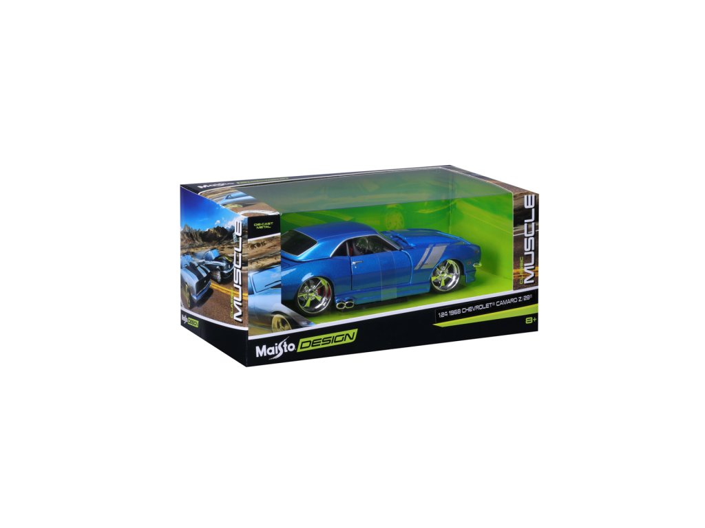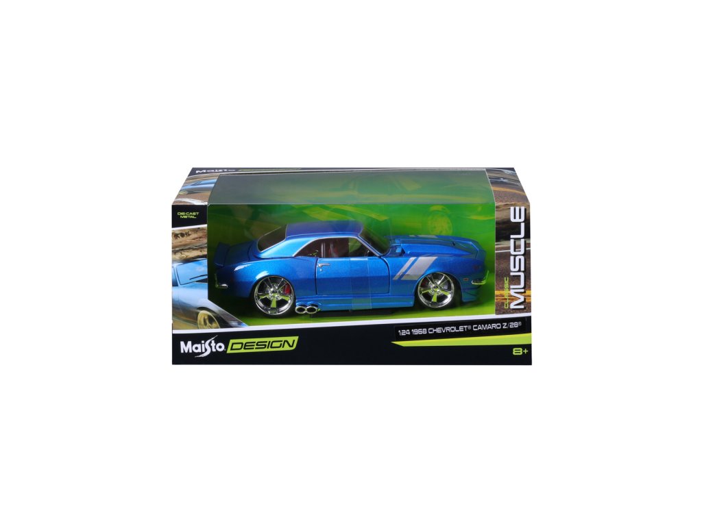 1968 CHEVROLET CAMARO Z/28. Model má velmi dokonalé, detailní provedení jednotlivých částí a kvalitní barevné provedení. Kovový model s plastovými doplňky. U modelu lze otevírat dveře, víko motoru. Kovové modely v měřítku 1:24 patří mezi nejoblíbenější. Rozměry balení: 24,4x11,1x13,3cm. Věk: 3+