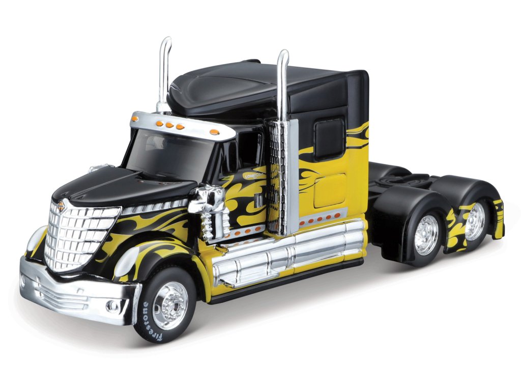International Lone Star, černo-žlutá. Zcela nové kovové modely tracků s plastovými doplňky. Modely mají gumová kolečka, detailní provedení interierů, včetně výrazného barevného provedení, které jim umožňuje vyniknout od ostatních modelů. Balení: 16,4x8,2x7,6cm. Věk: 8+