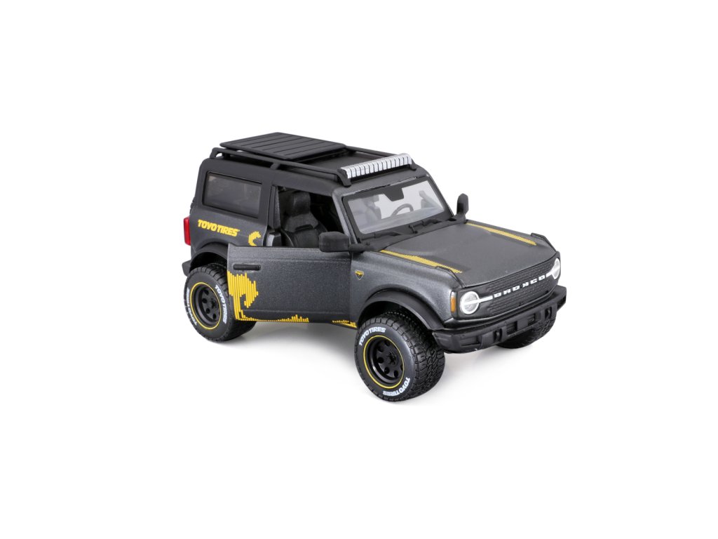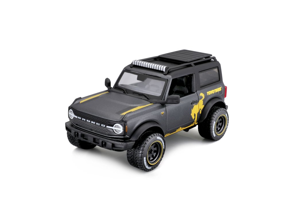 2021 Ford Bronco Badlands. Model auta v měřítku 1:24 vyrobený z kovových a plastových dílů. Baleno v papírové krabičce s fóliovým průhledem.U modelu lze otevřít dveře. Rozměry balení: 24,4x11,1x13,3cm. Věk: 3+