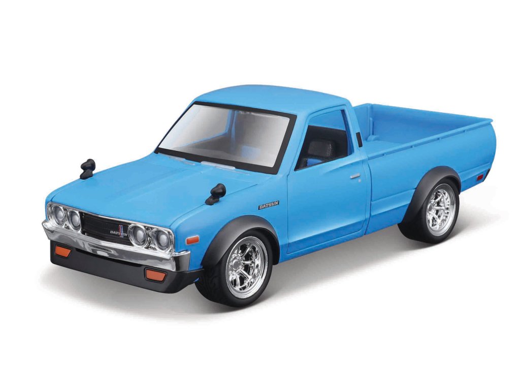 1973 Datsun 620 Pick-up. Model auta v měřítku 1:24 vyrobený z kovových a plastových dílů. Baleno v papírové krabičce s fóliovým průhledem. U modelu lze otevřít dveře, víko motoru. Rozměry balení: 24,4x11,1x13,3cm. Věk: 3+