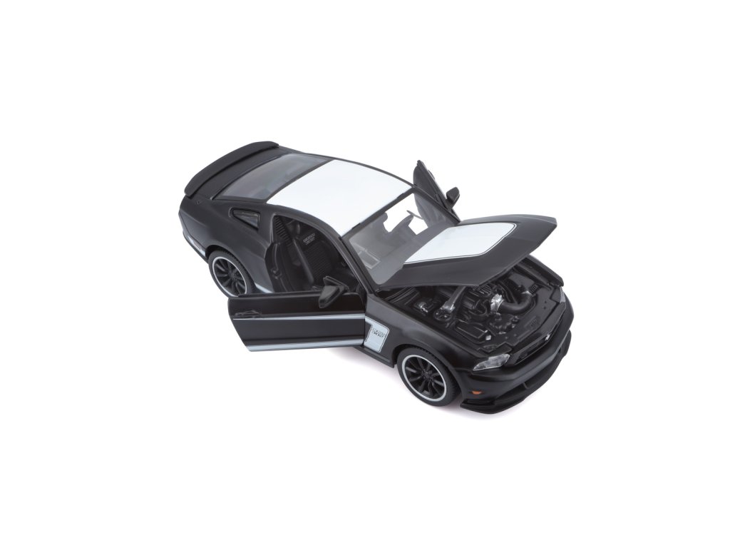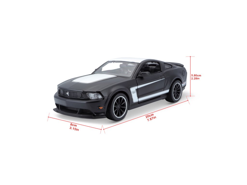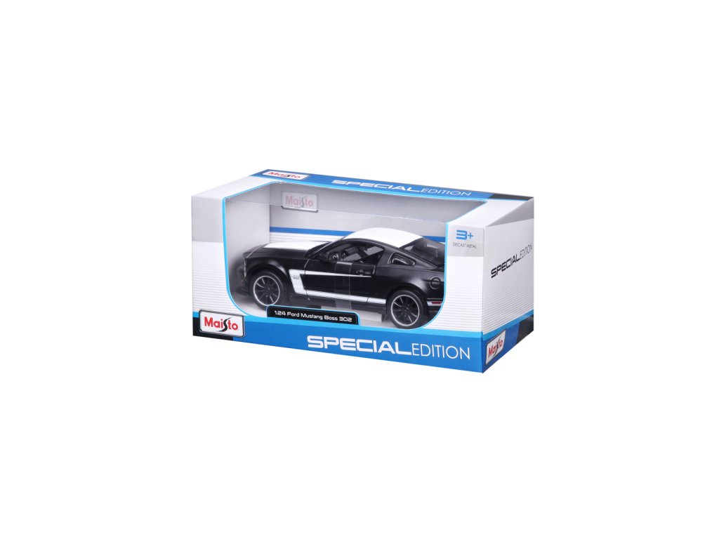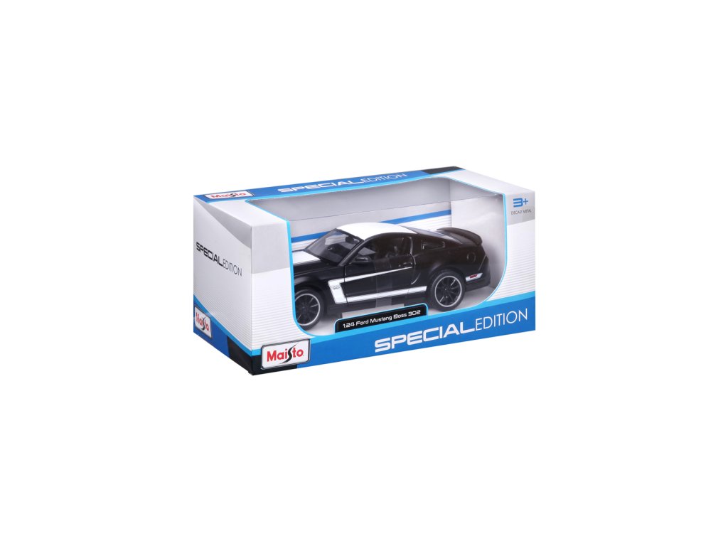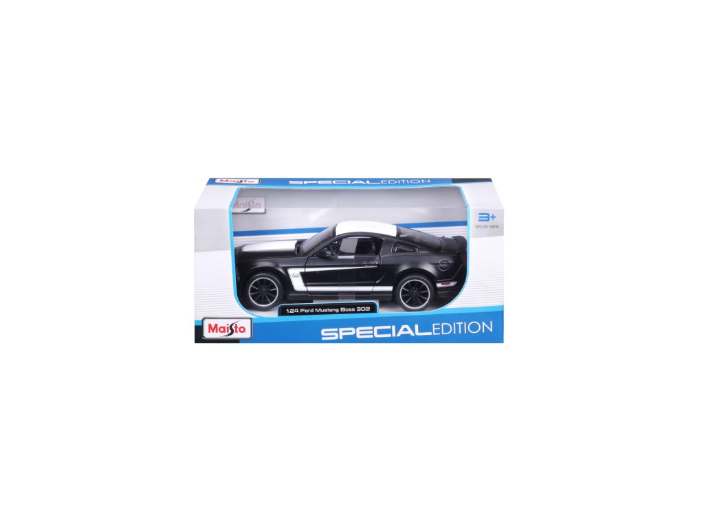 Ford Mustang Boss 302, matně černá. Kovové modely Maisto v měřítku 1:24 patří mezi nejoblíbenější. Mají velmi dokonalé detailní provedení jednotlivých částí a kvalitní barevné provedení. Má otevíratelnou přední kapotu a přední dveře. Baleno v krabičce. Nevhodné pro děti do 3let. Rozměry balení: 22,8x10,5x11,4cm. Věk: 3+