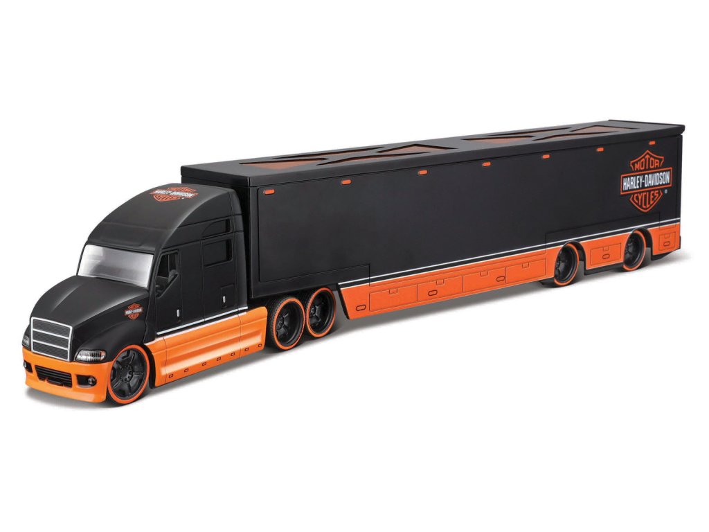 Harley-Davidson Haulers, černá. Náklaďák v oficiální licenci Harley-Davidson v měřítku 1:64. Kovová kabina a plastový návěs, který vyklopí. Takový realistický náklaďák může plnit funkci nejen hračky, ale také sběratelského modelu na poličce dětí i dospělých. Balení: 38,4x10,2x6,3cm. Věk: 8+