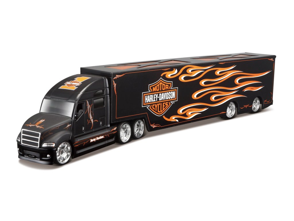 Harley-Davidson Haulers, plameny. Náklaďák v oficiální licenci Harley-Davidson v měřítku 1:64. Kovová kabina a plastový návěs, který vyklopí. Takový realistický náklaďák může plnit funkci nejen hračky, ale také sběratelského modelu na poličce dětí i dospělých. Balení: 38,4x10,2x6,3cm. Věk: 8+