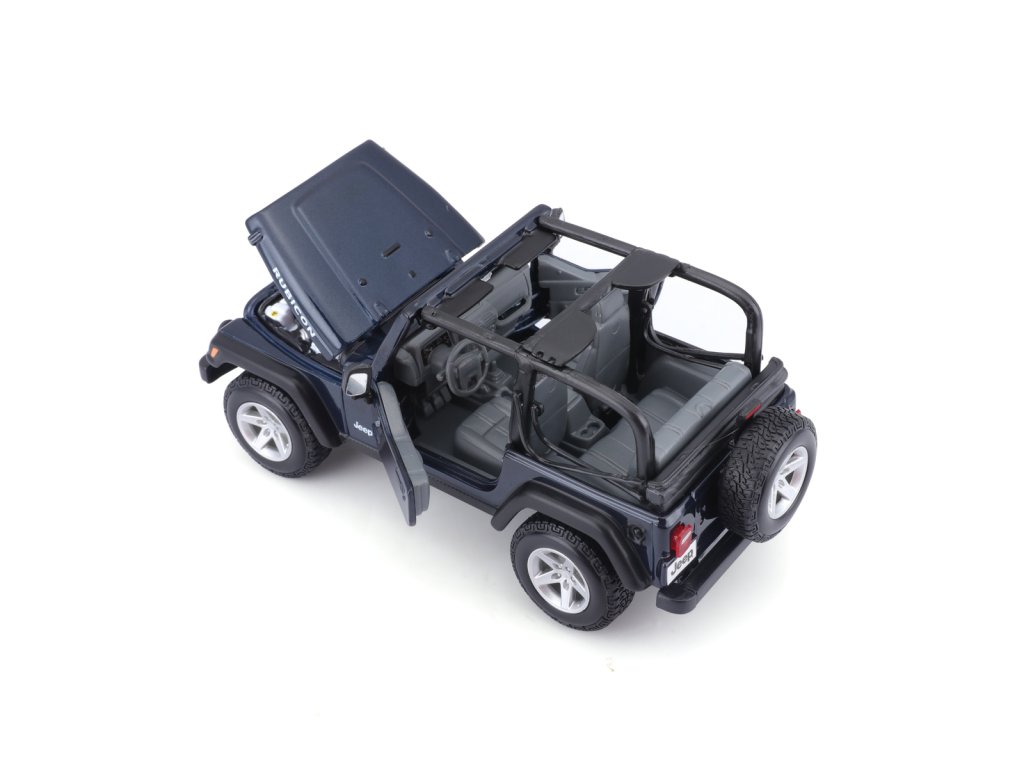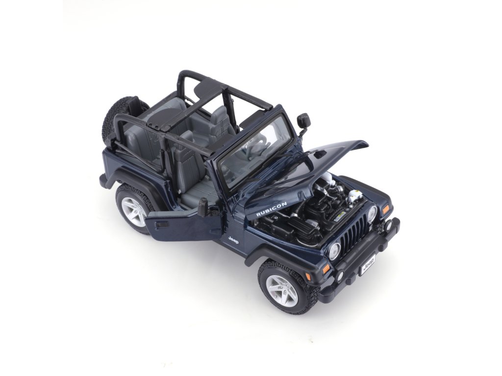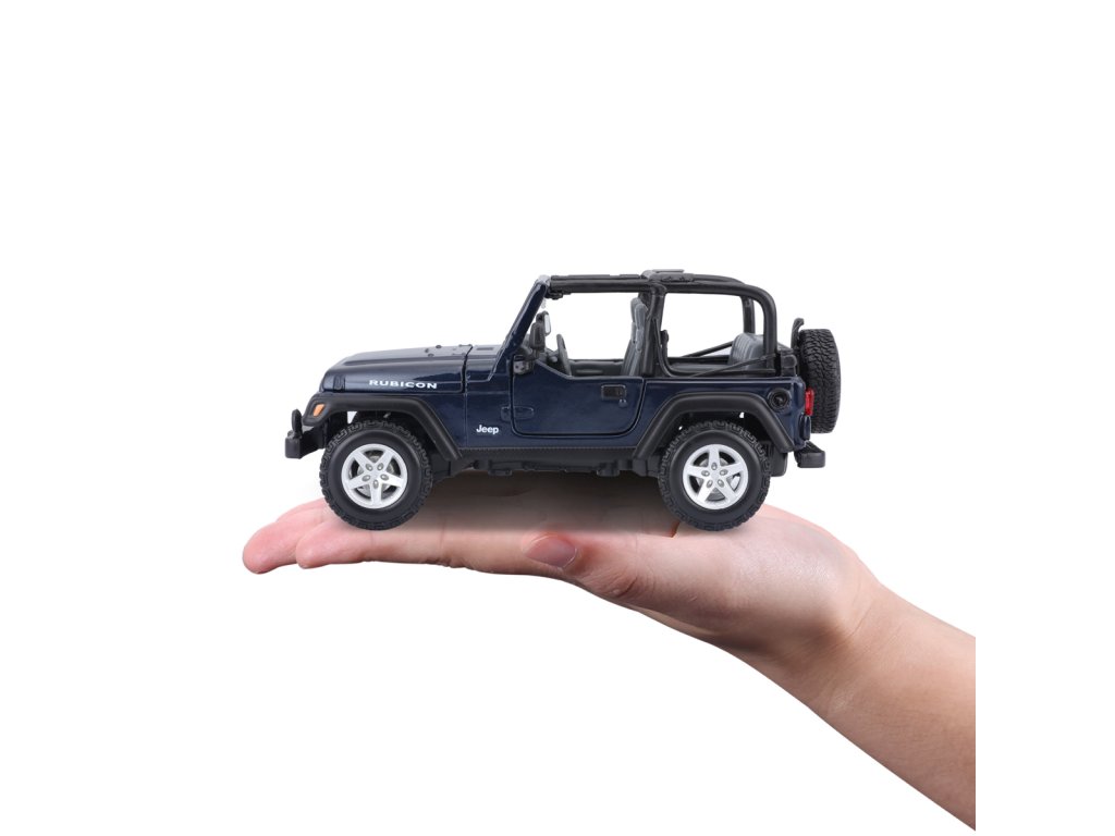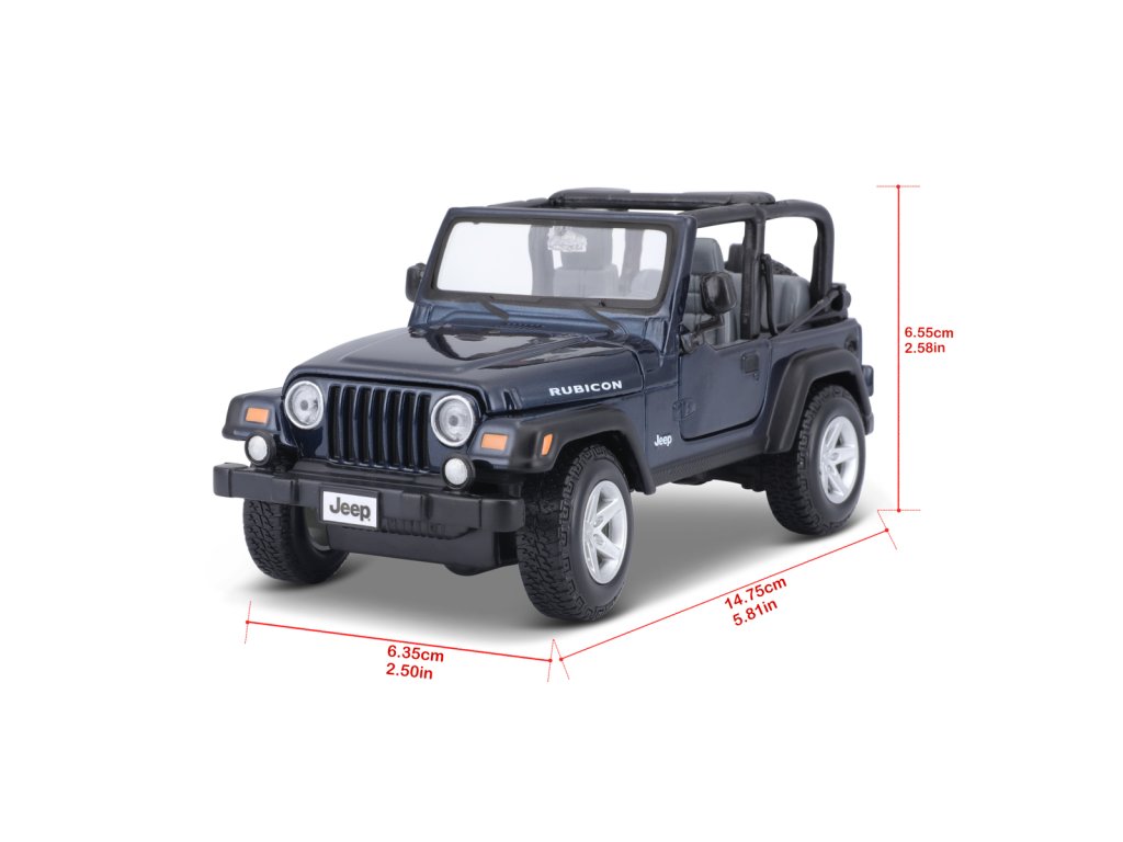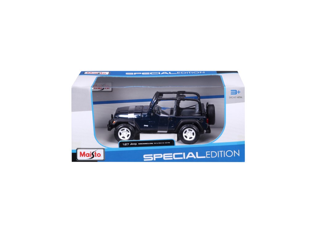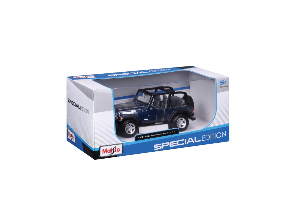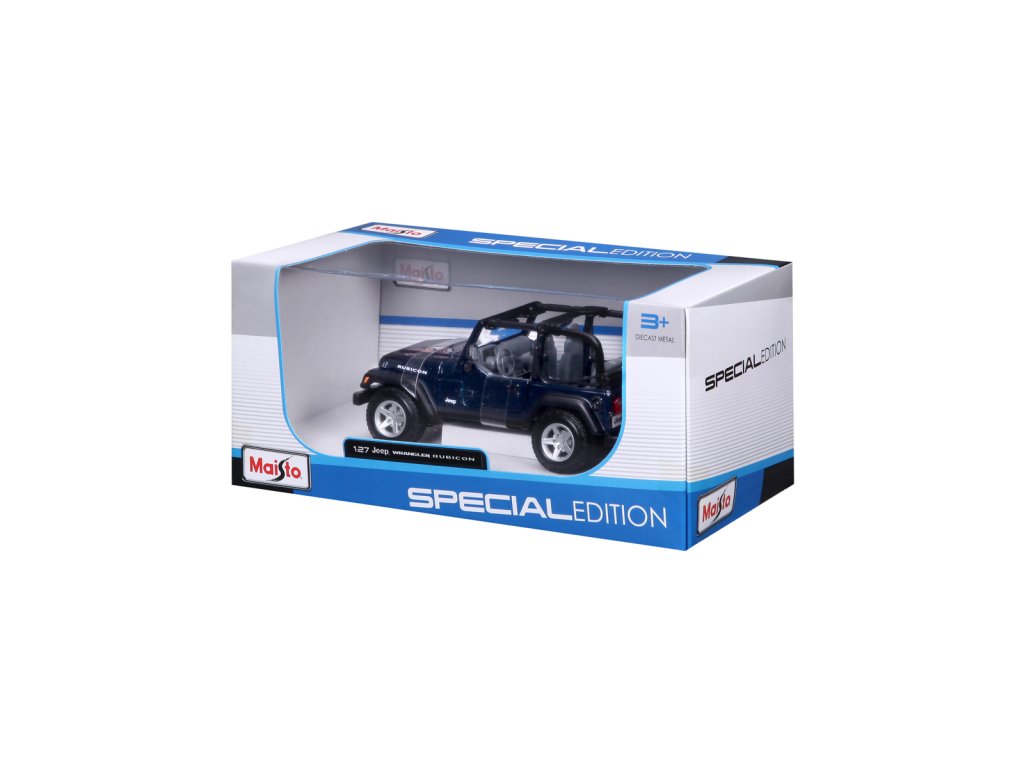 Jeep Wrangler Rubicon. Kovové modely Maisto v měřítku 1:27 patří mezi nejoblíbenější. Mají velmi dokonalé detailní provedení jednotlivých částí a kvalitní barevné provedení. Má otevíratelnou přední kapotu a přední dveře. Baleno v krabičce. Nevhodné pro děti do 3let. Rozměry balení: 22,8x10,5x11,4cm. Věk: 3+