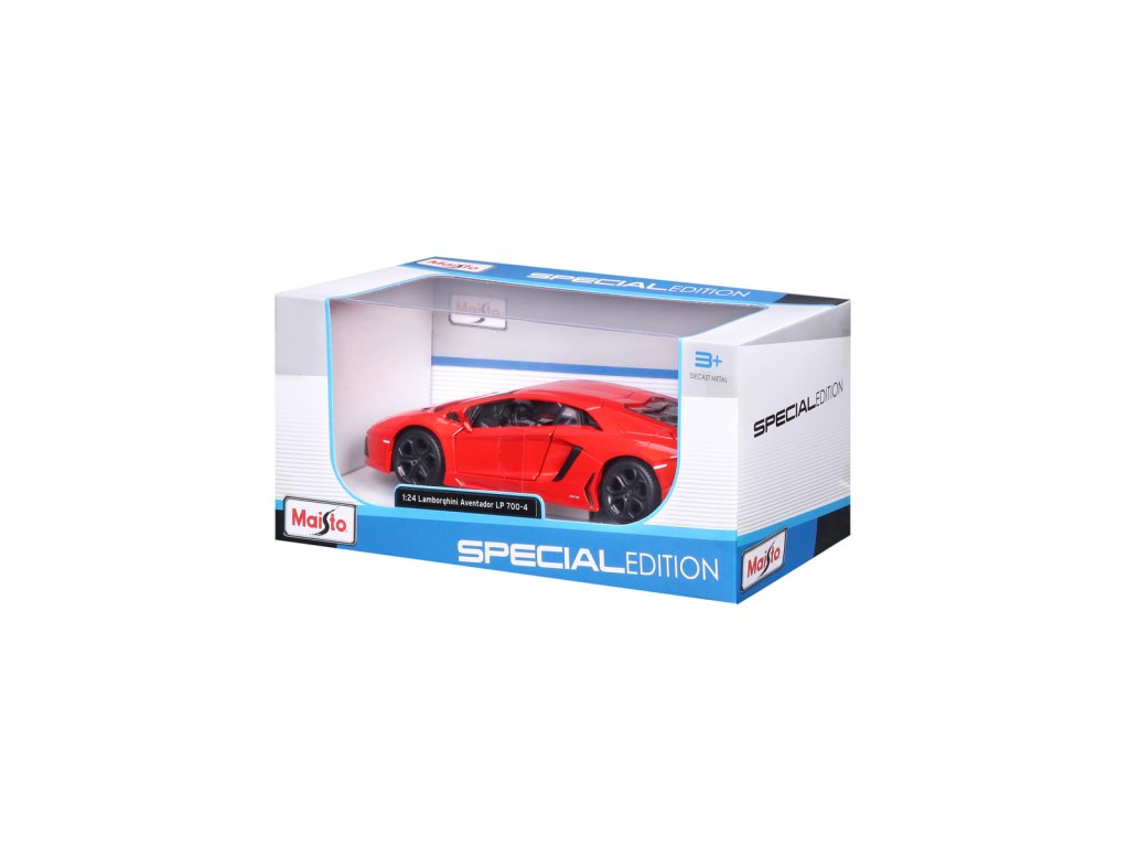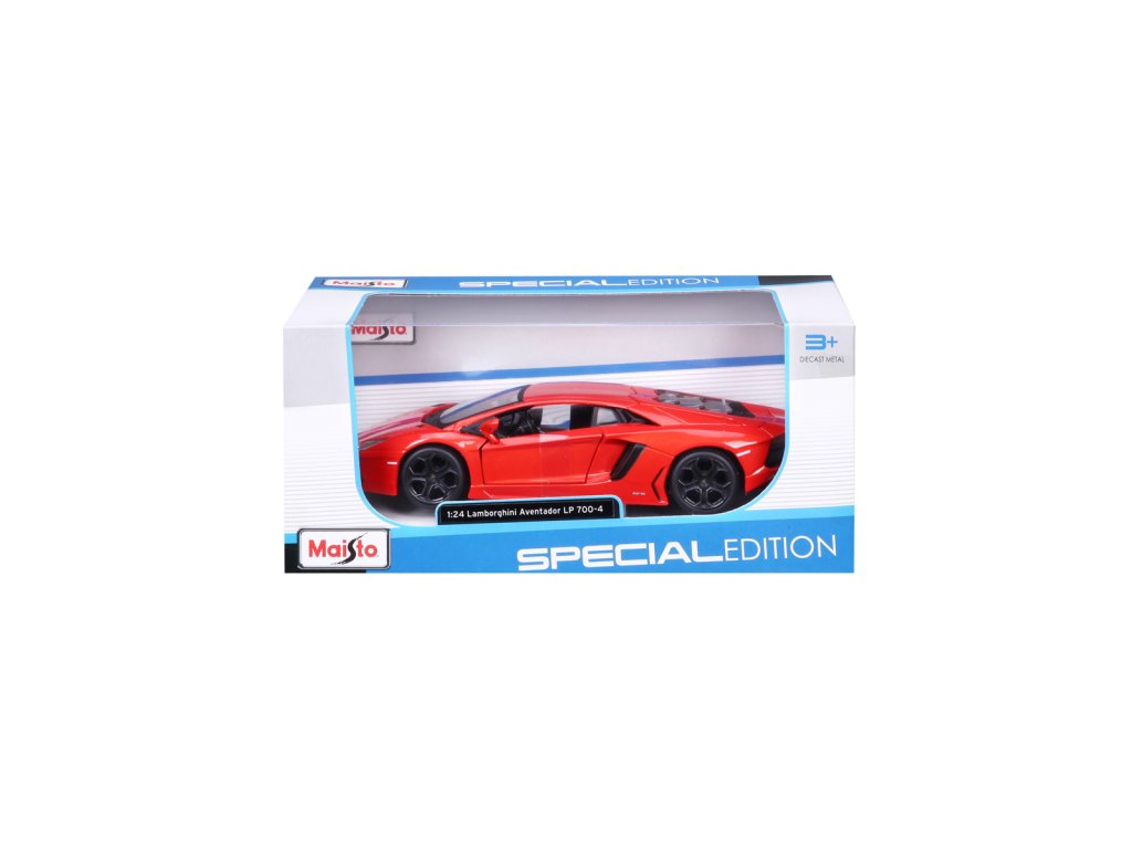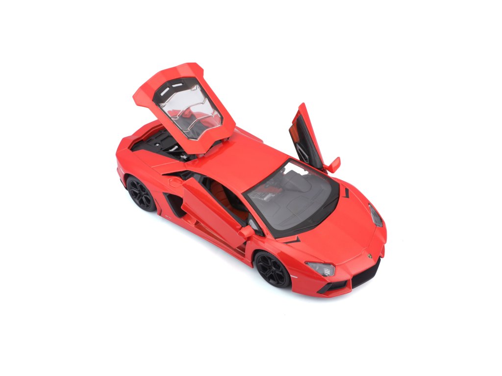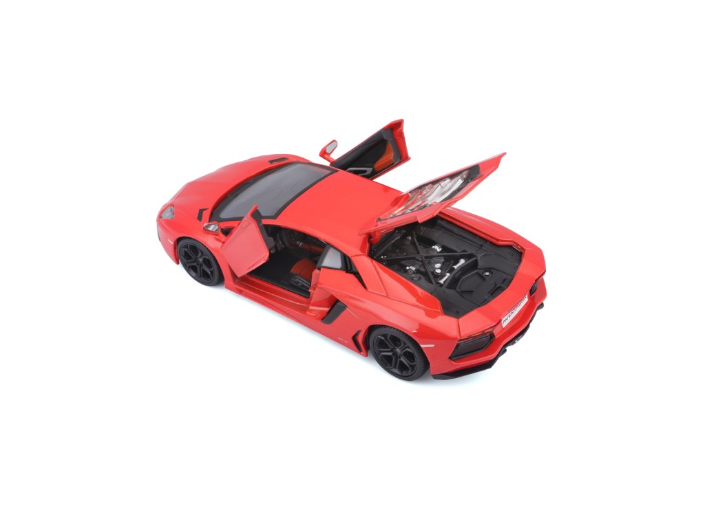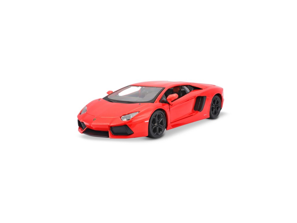 Lamborghini Aventador Coupé, oranžová. Kovové modely Maisto v měřítku 1:24 patří mezi nejoblíbenější. Mají velmi dokonalé detailní provedení jednotlivých částí a kvalitní barevné provedení. Má otevíratelnou přední kapotu a přední dveře. Baleno v krabičce. Nevhodné pro děti do 3let. Věk: 3+