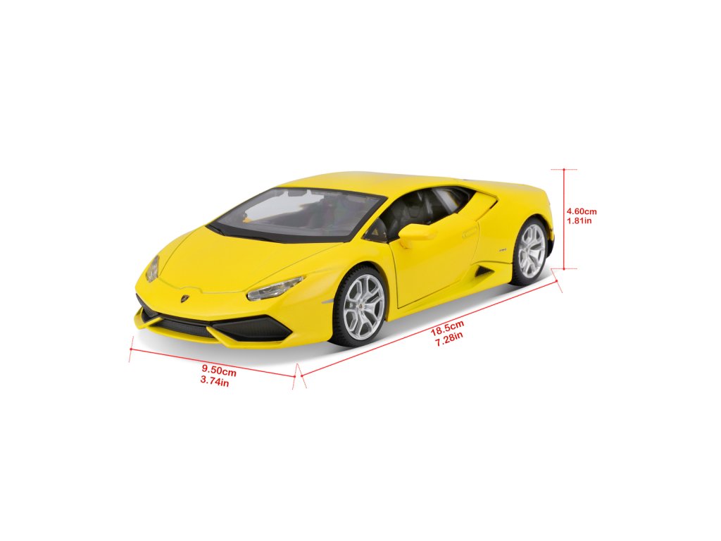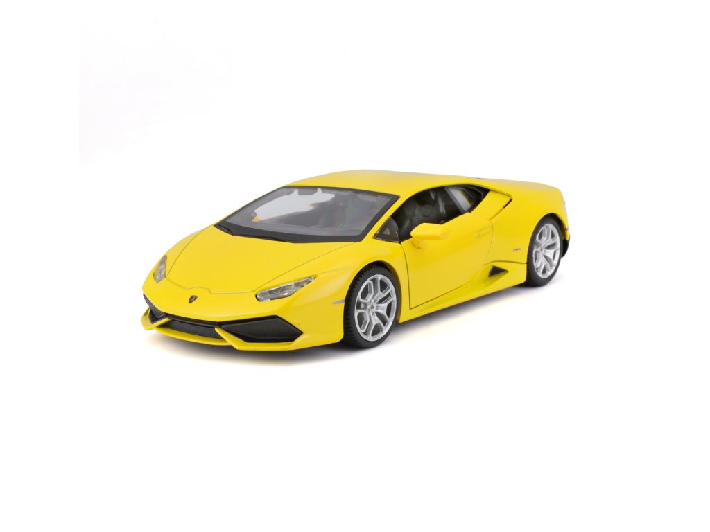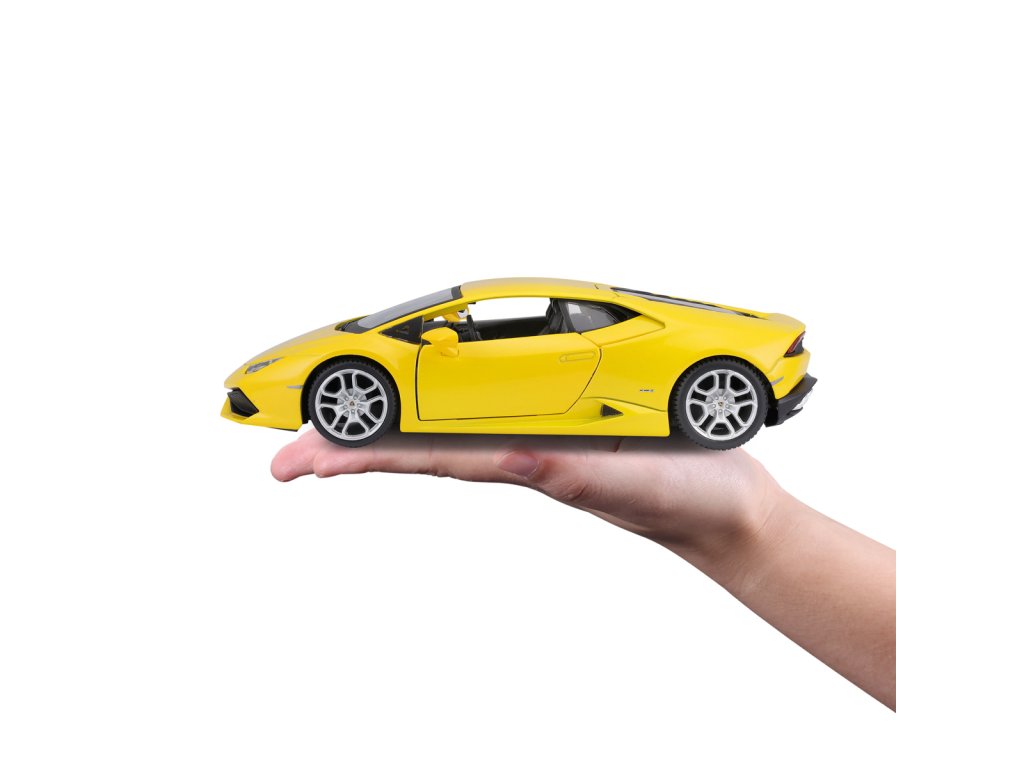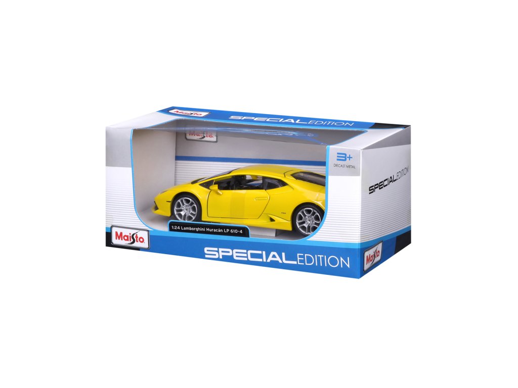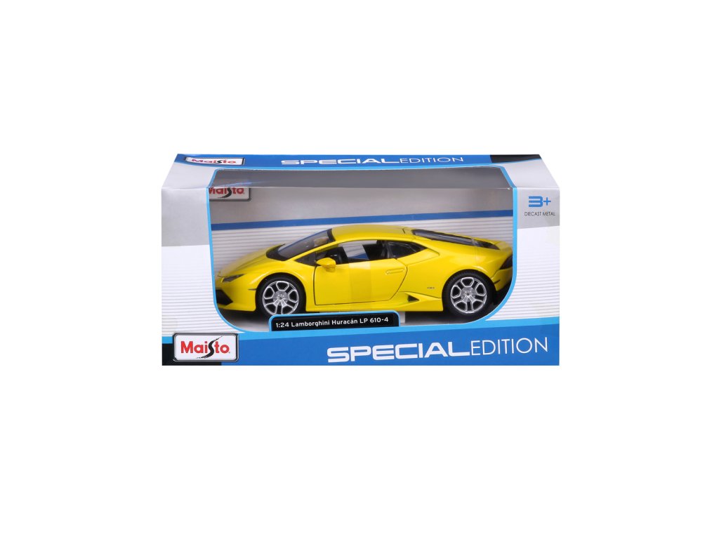 Lamborghini Huracán LP 610-4, perlově žlutá. Kovové modely Maisto v měřítku 1:24 patří mezi nejoblíbenější. Mají velmi dokonalé detailní provedení jednotlivých částí a kvalitní barevné provedení. Má otevíratelnou přední kapotu a přední dveře. Baleno v krabičce. Nevhodné pro děti do 3let. Rozměry balení: 22,8x10,5x11,4cm. Věk: 3+