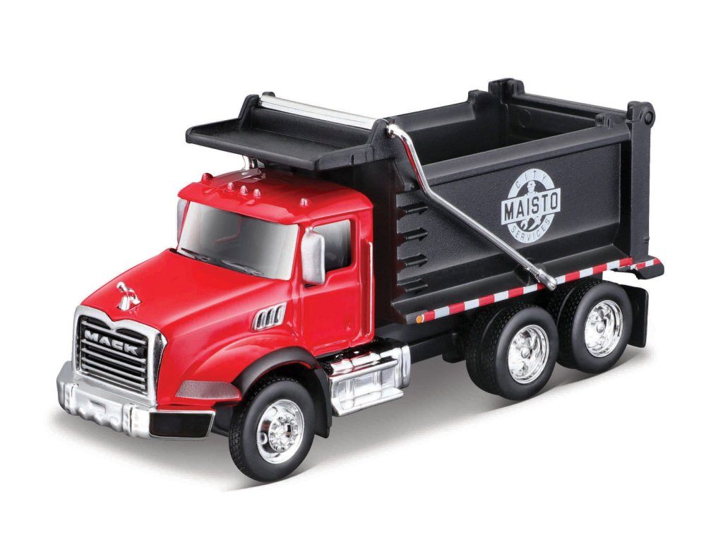 Mack Granite trucks, sklápěč. Měkké gumové otočné pneumatiky. Oknem se lze prohlédnout interiér. Pohyblivé části. Balení: 17,1x8,2x7cm. Věk: 3+