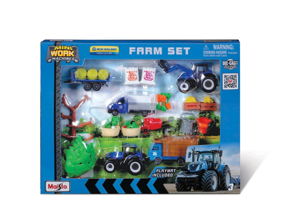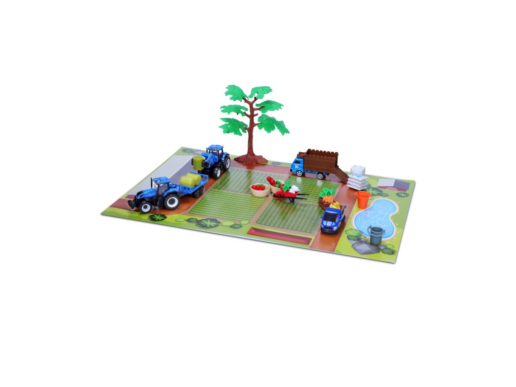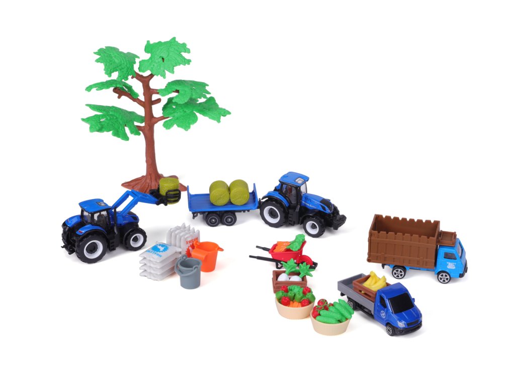 Farmářský set, New Holland. Model traktoru New Holland. Kovová kabina a plastové prvky. Obsahuje 2 přívěsné vozíky a příslušenství k vybudování vlastní farmy. Rozměry balení: 30,4x23,2x4,4cm. Věk: 3+.