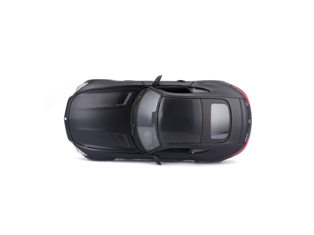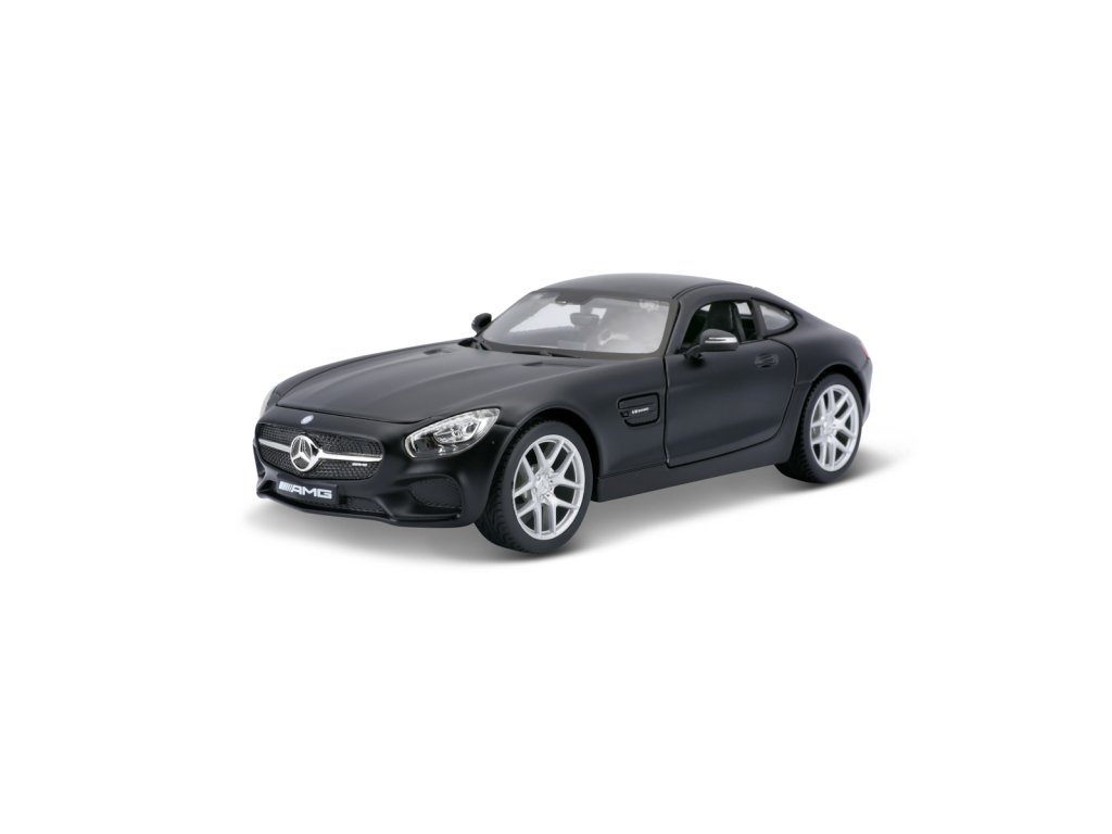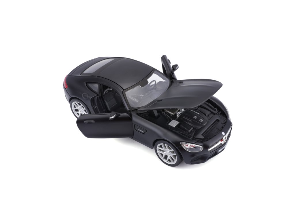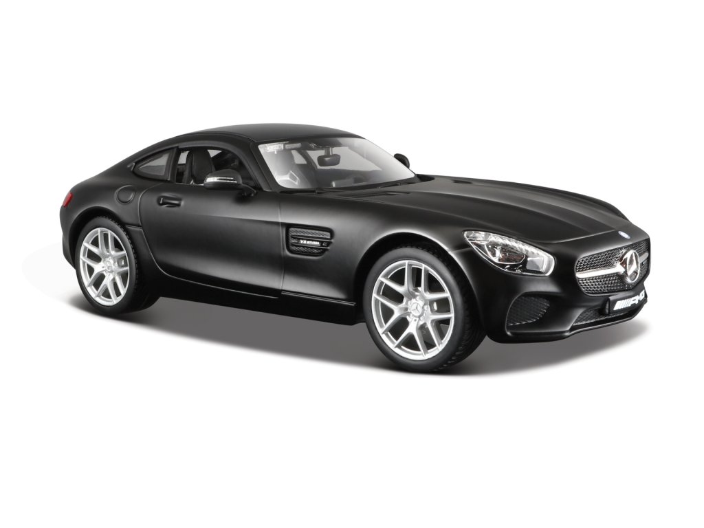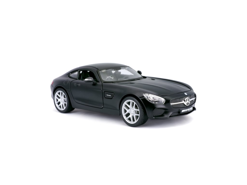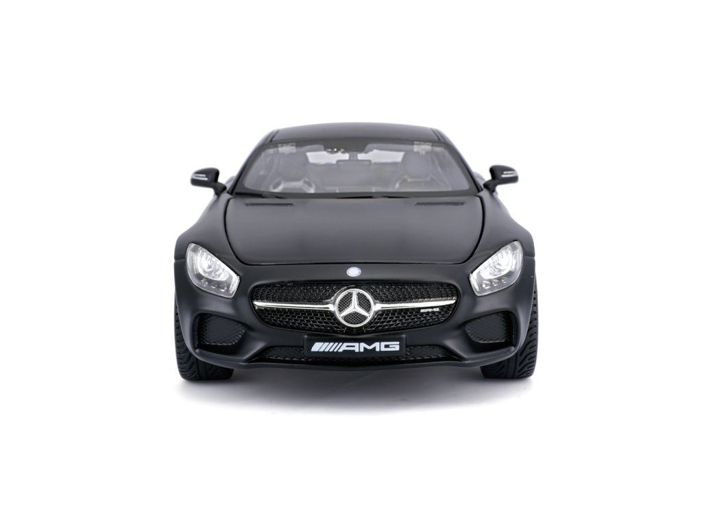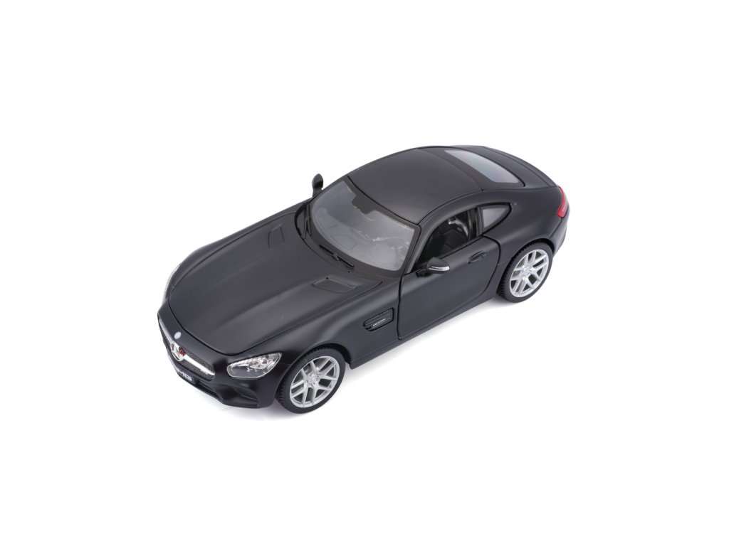 Mercedes-AMG GT, matná černá. Kovové modely Maisto v měřítku 1:24 patří mezi nejoblíbenější. Mají velmi dokonalé detailní provedení jednotlivých částí a kvalitní barevné provedení. Má otevíratelnou přední kapotu a přední dveře. Baleno v krabičce. Nevhodné pro děti do 3let. Věk: 3+