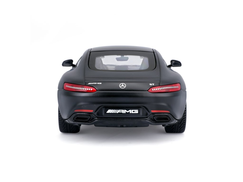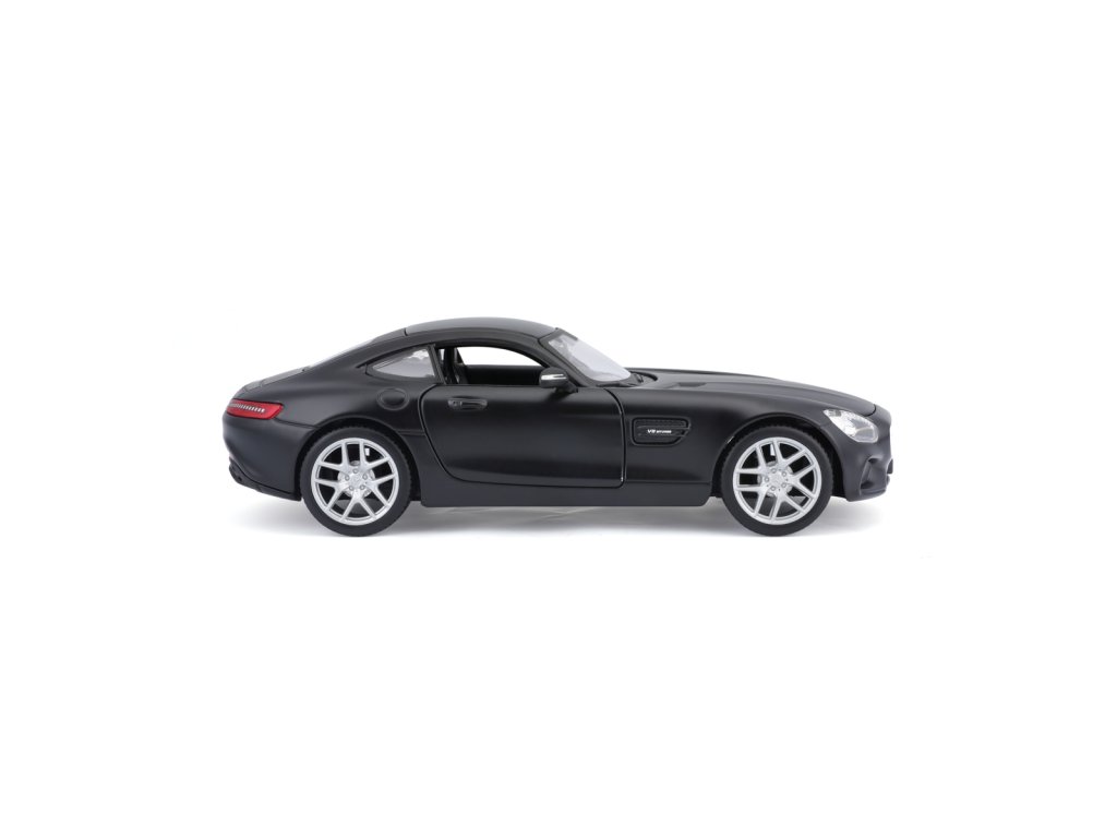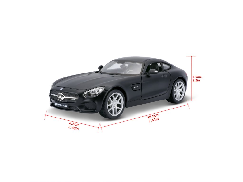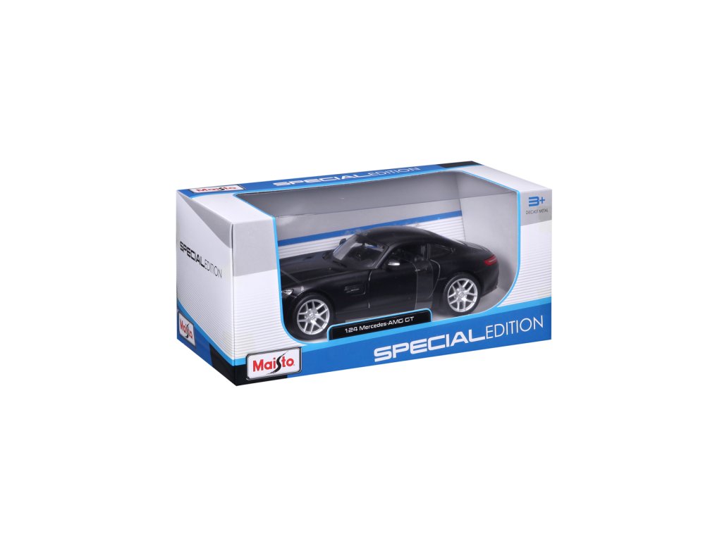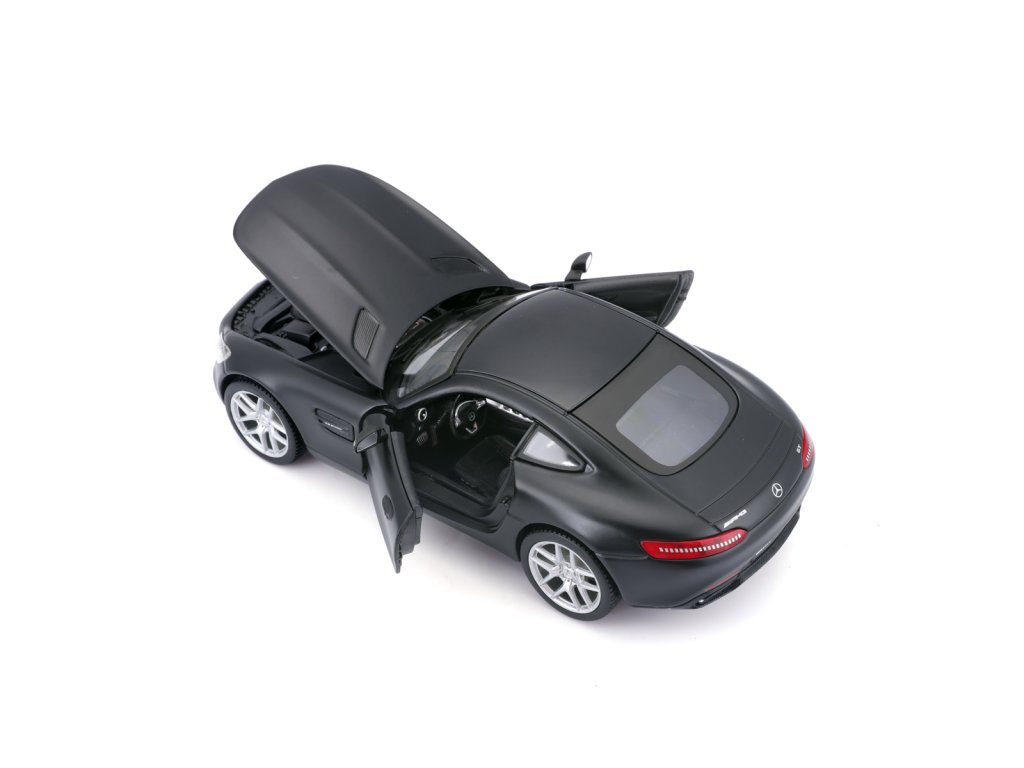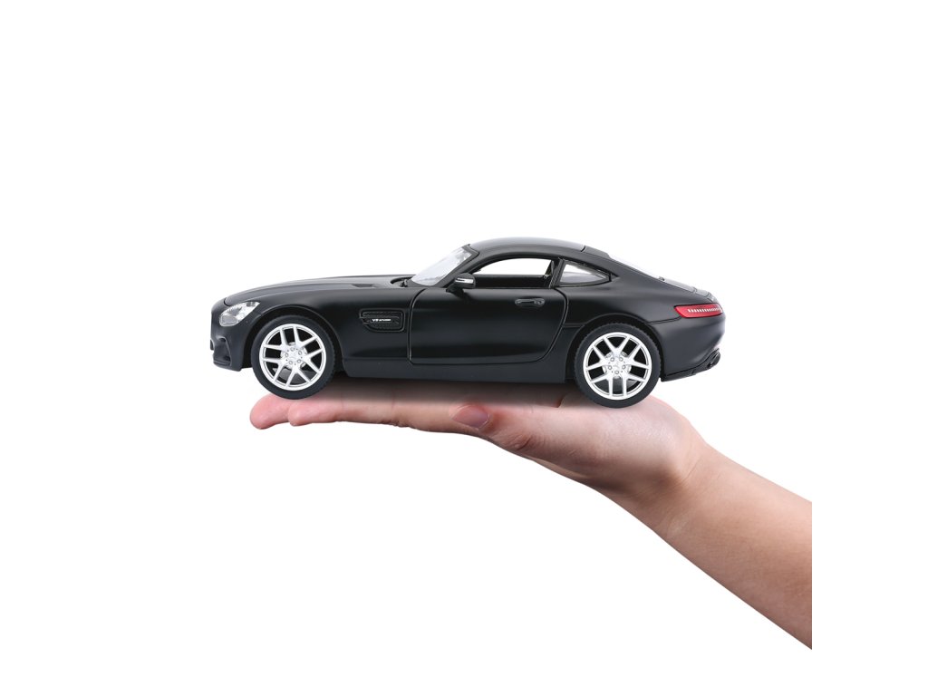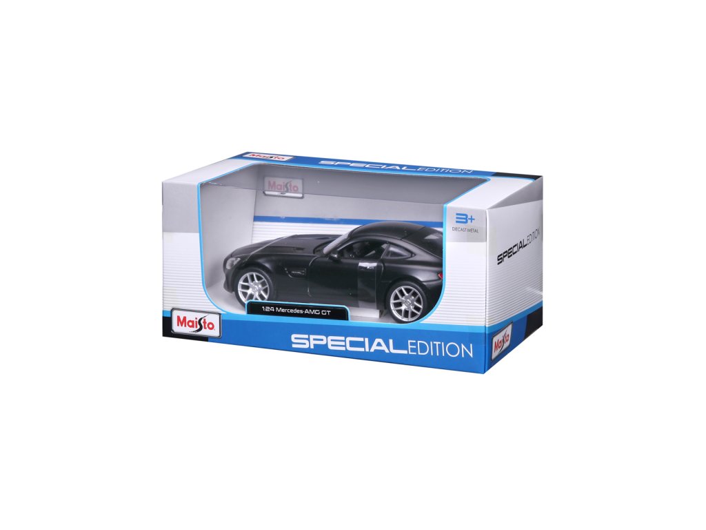 Mercedes-AMG GT, matná černá. Kovové modely Maisto v měřítku 1:24 patří mezi nejoblíbenější. Mají velmi dokonalé detailní provedení jednotlivých částí a kvalitní barevné provedení. Má otevíratelnou přední kapotu a přední dveře. Baleno v krabičce. Nevhodné pro děti do 3let. Věk: 3+