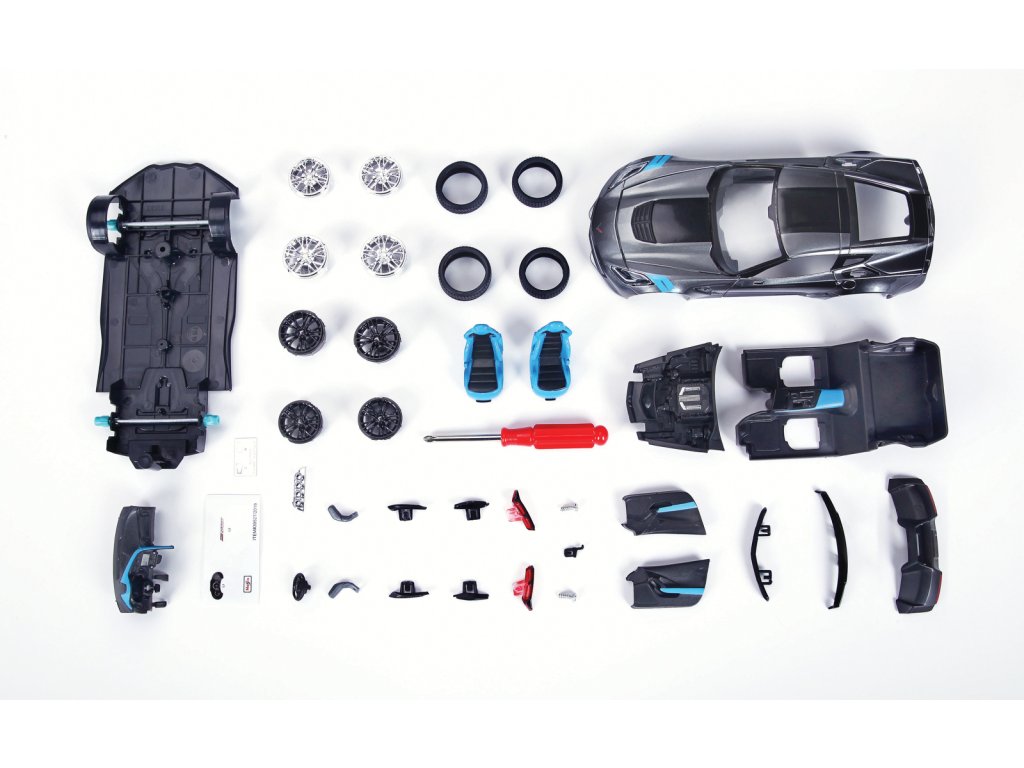 2017 Corvette Grand Sport. Model auta se skládá podle obrázkového návodu, který je součástí stavebnice. Jednotlivé části se spojují tlakem bez pomoci lepidla. Kovové části jsou natřené netoxickými barvami. Není potřeba je dobarvovat. Stavebnice obsahuje šroubovák. Balení: 22,8x16,8x10cm. Věk: 8+