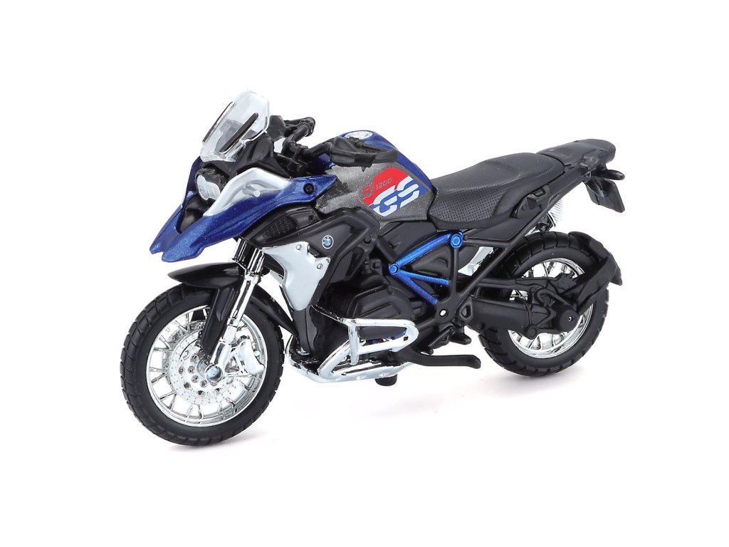 BMW R 1200 GS 2017. Kovové modely motocyklů v modelovém měřítku 1:18. Motocykly mají otáčivá řidítka a odpruženou zadní nápravu. Jsou usazeny na černém plastovém podstavci. Dvě barevné varianty. Assort je náhodný mix modelů. Výběr nelze ovlivnit. Rozměry balení: 16x10,5x7cm. Věk: 3+