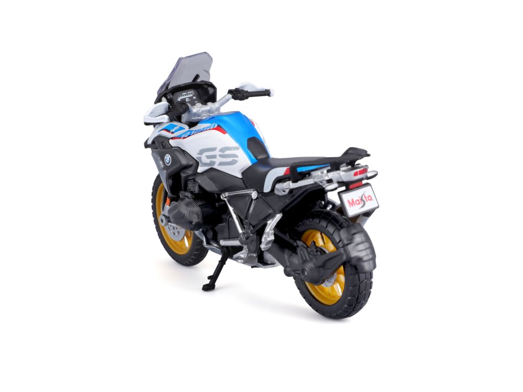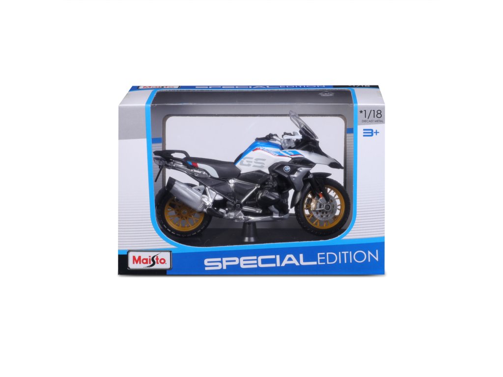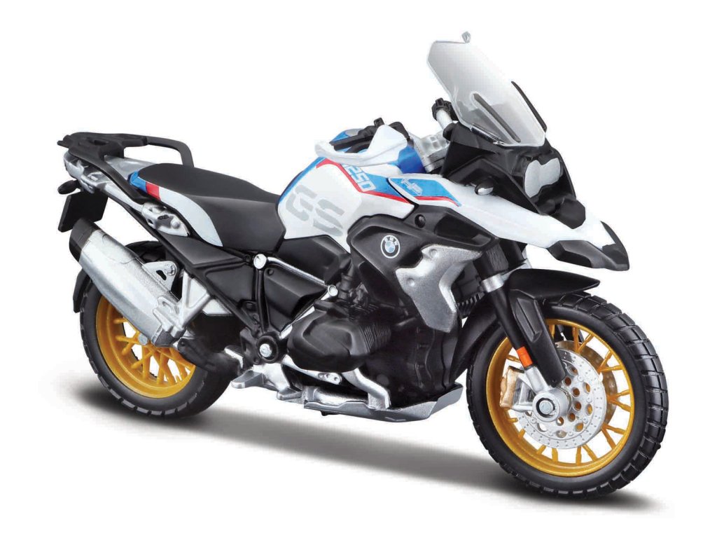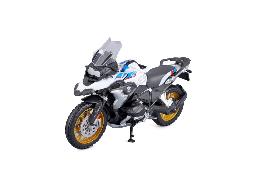 BMW R 1250 GS. Kovové modely motocyklů v modelovém měřítku 1:18. Motocykly mají otáčivá řidítka a odpruženou zadní nápravu. Jsou usazeny na černém plastovém podstavci. Rozměry balení: 16x10,5x7cm. Věk: 3+