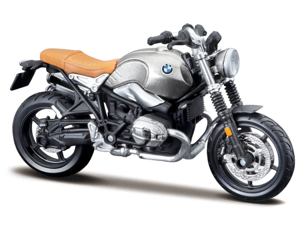 BMW R nineT Scrambler. Kovové modely motocyklů v modelovém měřítku 1:18. Motocykly mají otáčivá řidítka a odpruženou zadní nápravu. Jsou usazeny na černém plastovém podstavci. Rozměry balení: 16x10,5x7cm. Věk: 3+