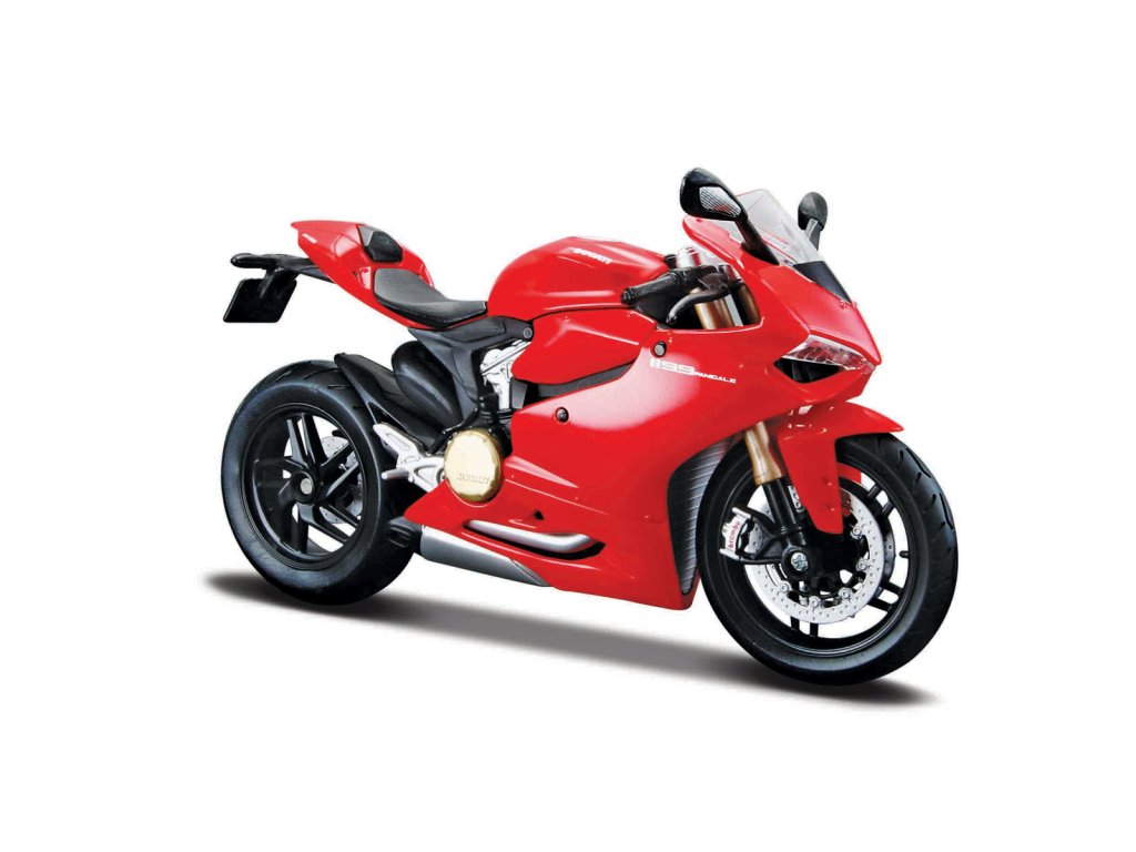 Ducati 1199 Panigale. Kovové modely motocyklů v modelovém měřítku 1:18. Motocykly mají otáčivá řidítka a odpruženou zadní nápravu. Jsou usazeny na černém plastovém podstavci. Rozměry balení: 16x10,5x7cm. Věk: 3+