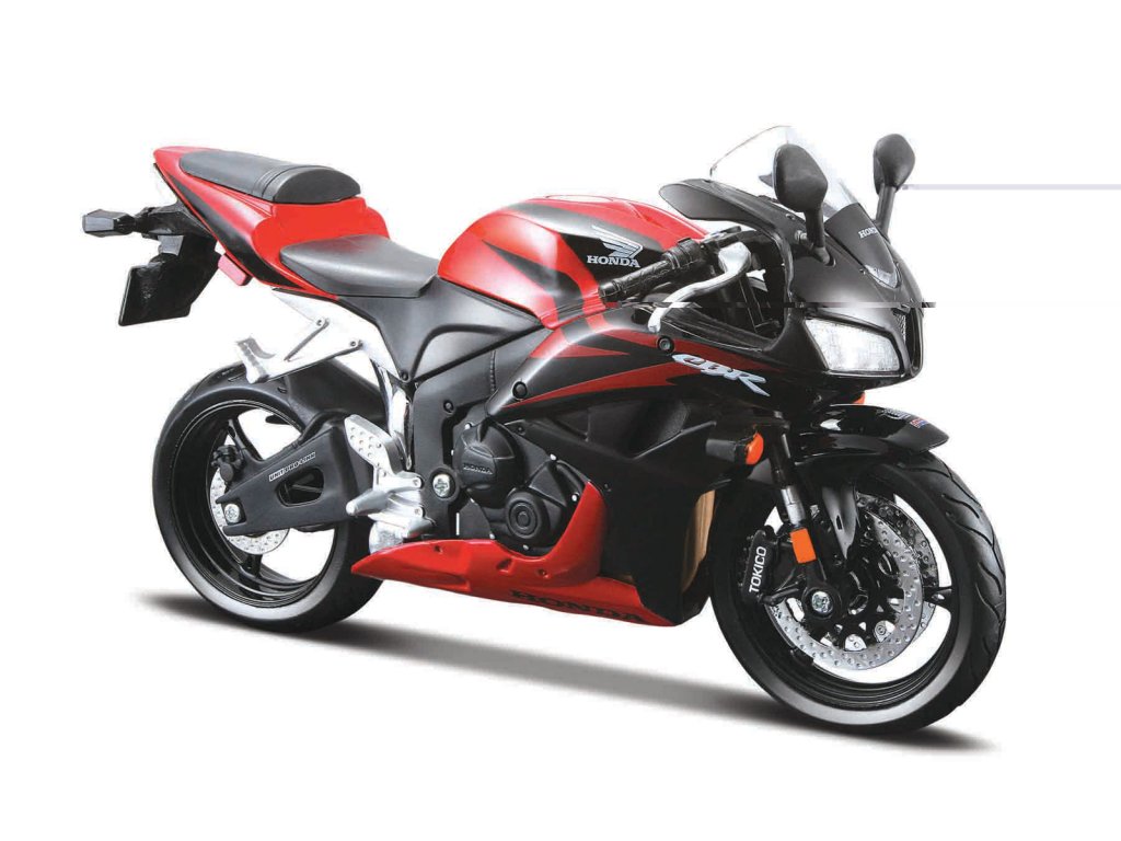 Honda CBR 600RR. Modely motocyklů v měřítku 1:12 mají u svých fanoušků velkou oblíbenost pro jejich dokonalé provedení a především velikost cca. 16 cm. Motocykly mají otáčivá řidítka a odpruženou zadní nápravu. Baleno v krabičce. Nevhodné pro děti do 3 let. Věk: 3+