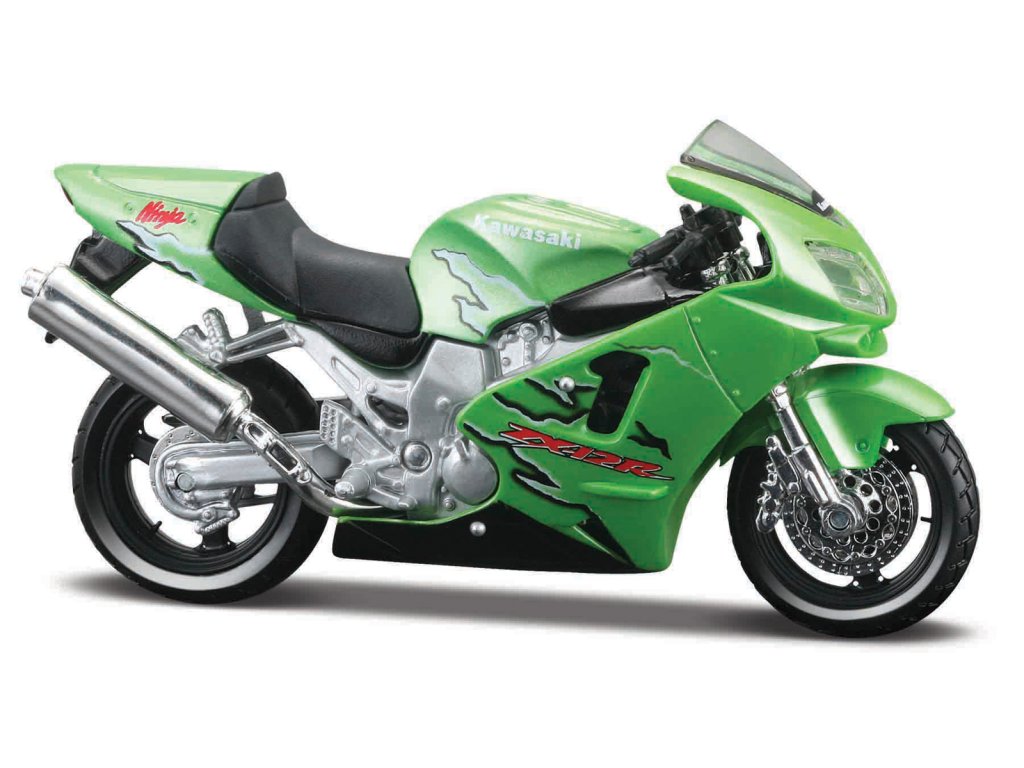 Kawasaki Ninja® ZX™-12R. Kovové modely motocyklů v modelovém měřítku 1:18. Motocykly mají otáčivá řidítka a odpruženou zadní nápravu. Jsou usazeny na černém plastovém podstavci. Rozměry balení: 16x10,5x7cm. Věk: 3+