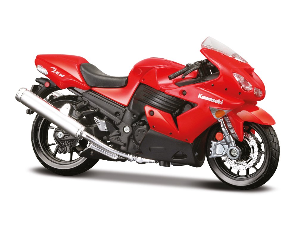 Kawasaki Ninja® ZX™-14R. Kovové modely motocyklů v modelovém měřítku 1:18. Motocykly mají otáčivá řidítka a odpruženou zadní nápravu. Jsou usazeny na černém plastovém podstavci. Rozměry balení: 16x10,5x7cm. Věk: 3+