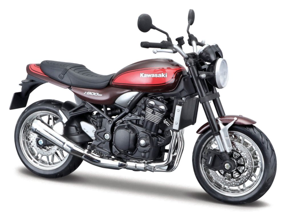 Kawasaki Z900RS. Modely motocyklů v měřítku 1:12 mají u svých fanoušků velkou oblíbenost pro jejich dokonalé provedení a především velikost cca. 16 cm. Motocykly mají otáčivá řidítka a odpruženou zadní nápravu. Baleno v krabičce. Nevhodné pro děti do 3 let. Věk: 3+