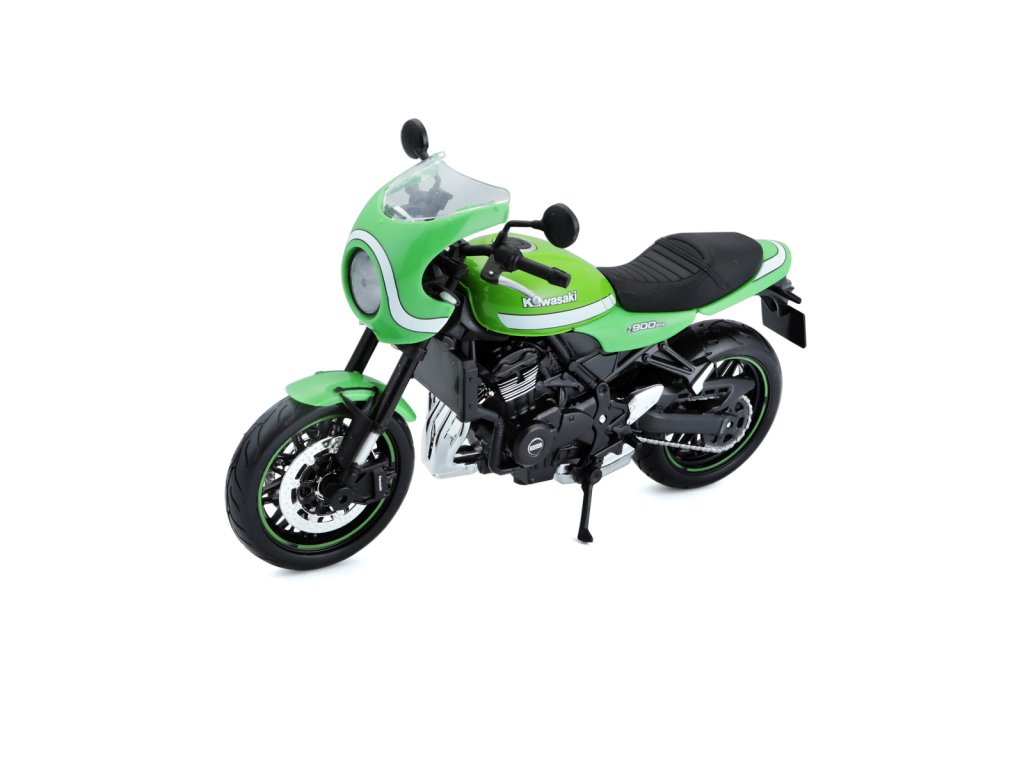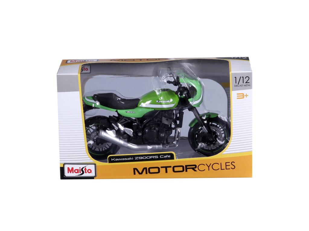 Kawasaki Z900RS Café. Modely motocyklů v měřítku 1:12 mají u svých fanoušků velkou oblíbenost pro jejich dokonalé provedení a především velikost cca. 16 cm. Motocykly mají otáčivá řidítka a odpruženou zadní nápravu. Baleno v krabičce. Nevhodné pro děti do 3 let. Věk: 3+
