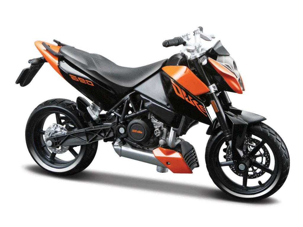 KTM 690 Duke. Kovové modely motocyklů v modelovém měřítku 1:18. Motocykly mají otáčivá řidítka a odpruženou zadní nápravu. Jsou usazeny na černém plastovém podstavci. Rozměry balení: 16x10,5x7cm. Věk: 3+