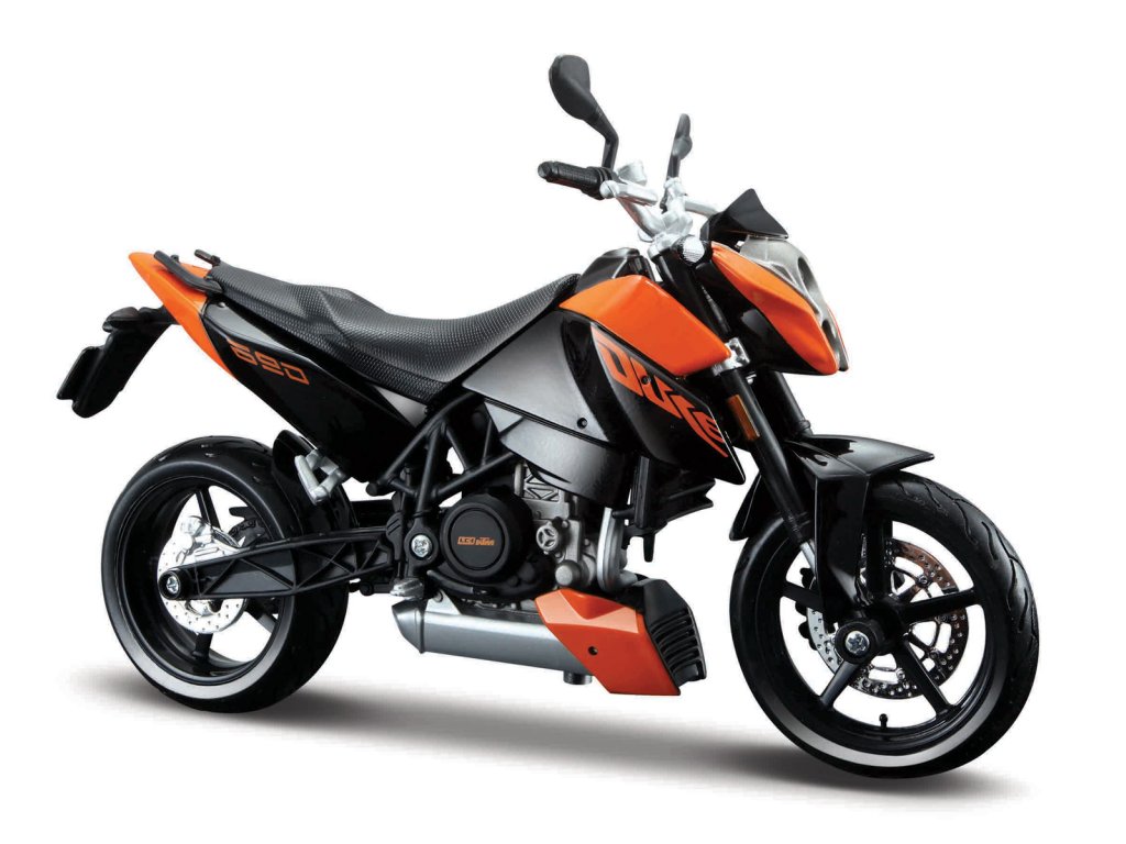 KTM 690 DUKE 3. Modely motocyklů v měřítku 1:12 mají u svých fanoušků velkou oblíbenost pro jejich dokonalé provedení a především velikost cca. 16 cm. Motocykly mají otáčivá řidítka a odpruženou zadní nápravu. Baleno v krabičce. Balení: 21,2x12x7cm. Věk: 3+