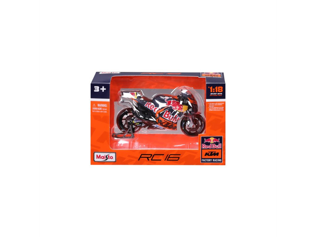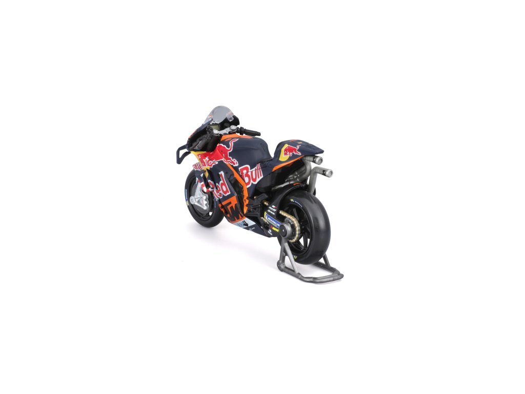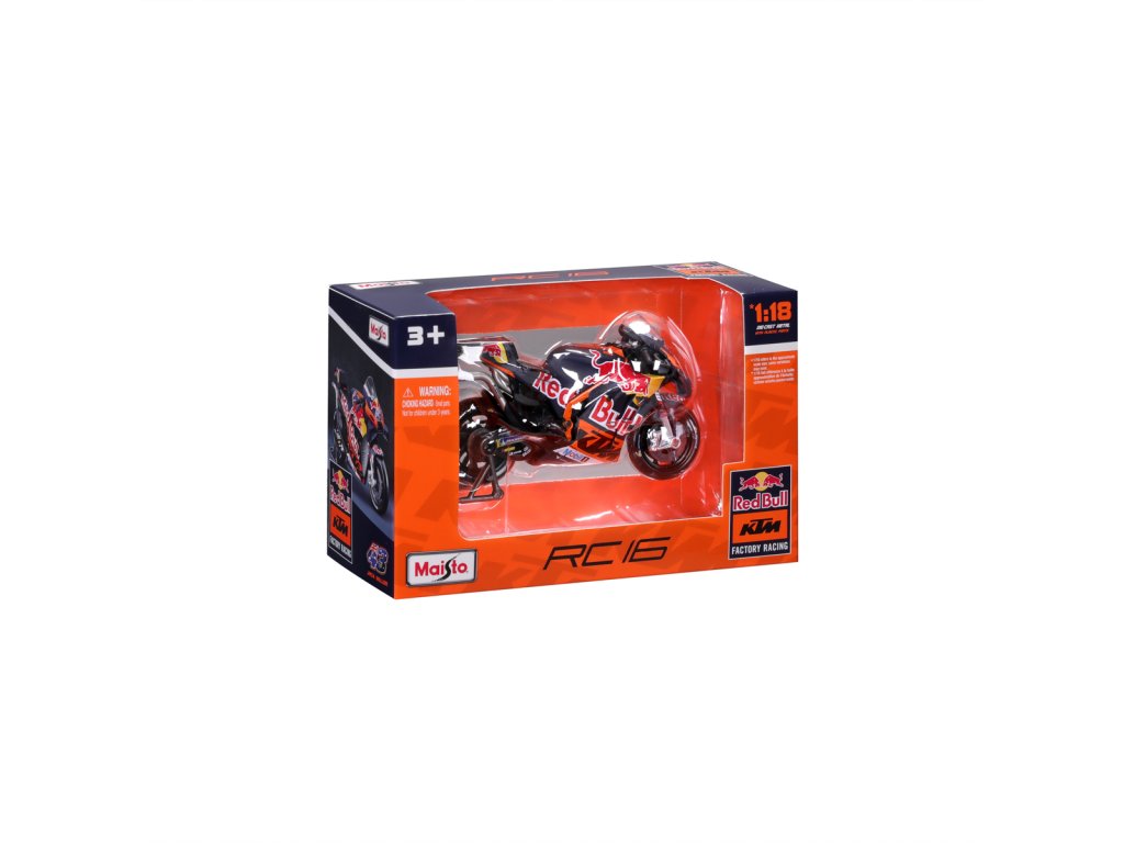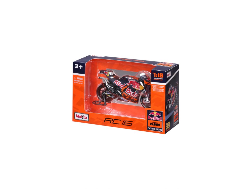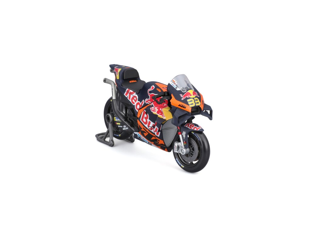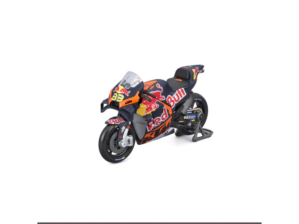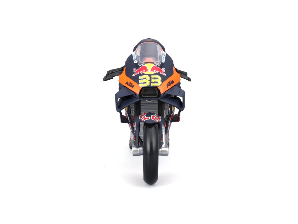 Motocykl GP Racing 1:18 Red Bull KTM Factory Racing 2023, #33 Brad Binder. Model oficiálního licencovaného závodního týmu má velmi dokonalé, detailní provedení jednotlivých částí a kvalitní barevné provedení. Kovový model s plastovými detaily. Model má volně se otáčející kola a je včetně podpěrného stojanu. Baleno v krabičce. Nevhodné pro děti do 3 let. Rozměry balení: 10,5 x 17,1 x 7 cm. Věk: 3 +