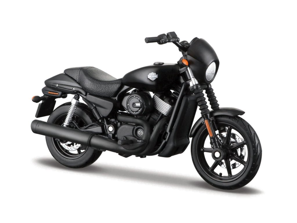 2015 Street 750. Model motocyklu v měřítku 1:12 mají u svých fanoušků velkou oblíbenost pro jejich dokonalé provedení a především velikost cca. 16 cm. Motocykl maá otáčivá řidítka a odpruženou zadní nápravu. Baleno v krabičce. Balení: 22,23x12,7x8,9cm . Věk: 3+