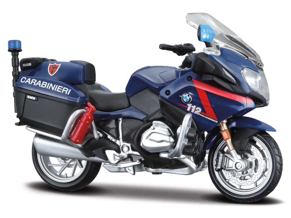 BMW R 1200 RT. Speciální model motocyklu BMW R11200RT vytvořeného přesně podle originálu policejního motocyklu BMW italské Policie. Modely v měřítku 1:18 mají u svých fanoušků velkou oblíbenost pro jejich dokonalé provedení. Motocykl má otáčivá řídítka a odpruženou zadní nápravu. Rozměry balení: 17,8x10,2x7cm. Věk: 3+