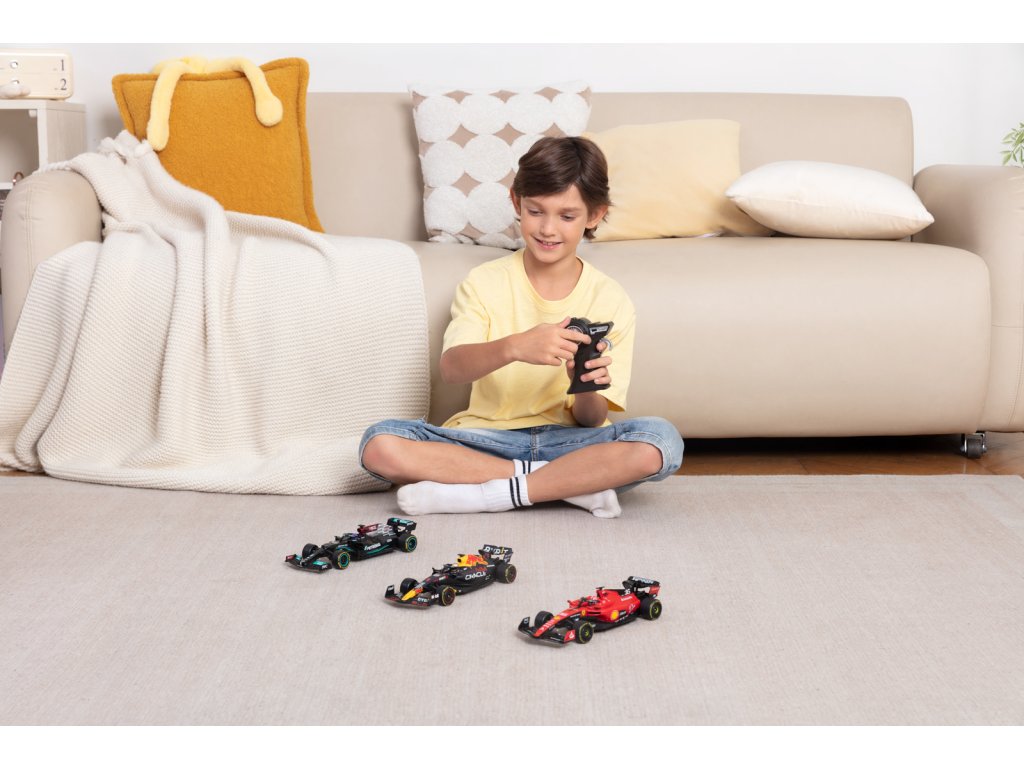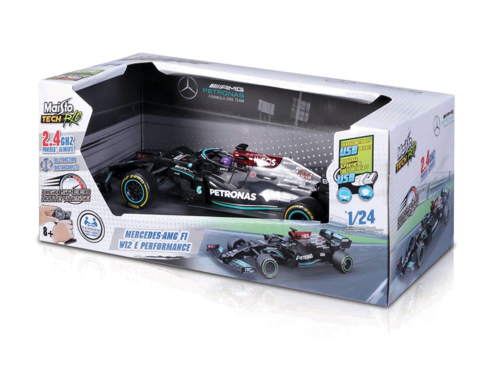 MERCEDES-AMG F1 W12 E Performance. Model závodní formule na dálkové ovládání od značky Maisto. Model je v měřítku 1:24. Vestavěná lithiová baterie, která se dobíjí pomocí přiloženého USB kabelu. Ovladač je na 2xAAA baterie, které jsou součástí balení. Dosah ovladače až 35m. Doba nabíjení 45 minut. Rozměry balení: 29,2x12x15,2cm. Věk: 8+