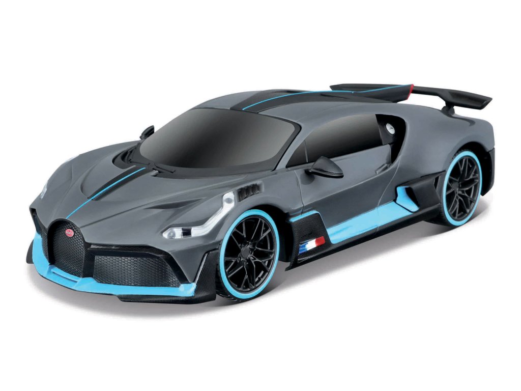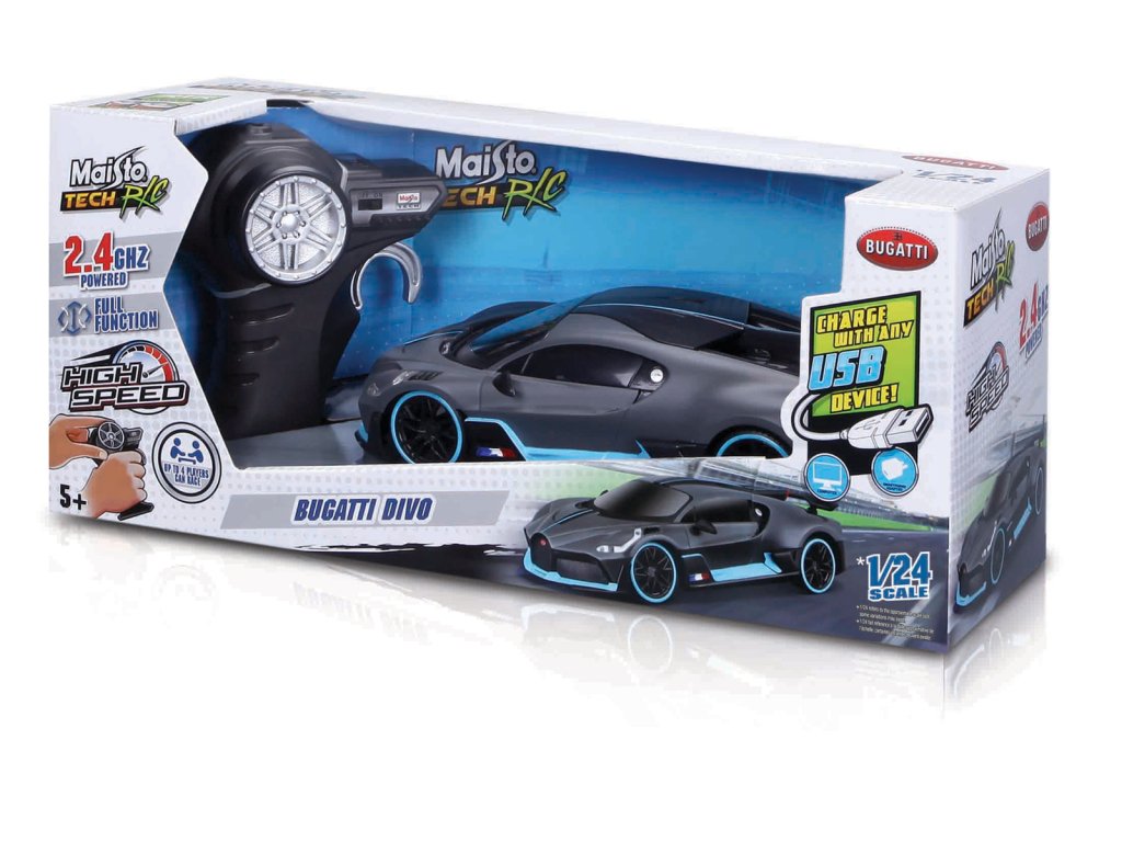 Bugatti Divo. Model sportovního vozu značky Maisto na dálkové ovládání. V měřítku 1:24. V autíčku je zabudovaná lithiová baterie, kterou lze dobíjet přes USB kabel. Ovladač obsahuje 2xAAA baterie (jsou součástí). Dosah ovládání až 35m. Doba nabíjení 45minut. Rozměry balení: 31,75x13,3x11,1cm. Věk: 5+