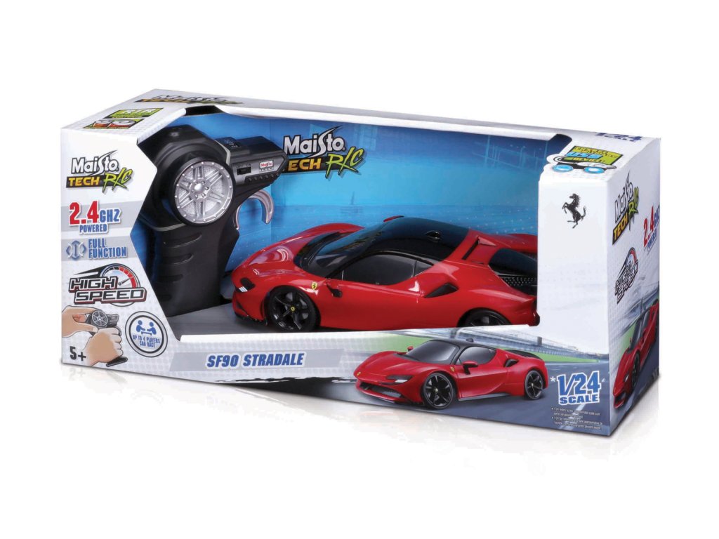 Ferrari SF90 Stradale. Model sportovního vozu značky Maisto na dálkové ovládání. V měřítku 1:24. V autíčku je zabudovaná lithiová baterie, kterou lze dobíjet přes USB kabel. Ovladač obsahuje 2xAAA baterie (jsou součástí). Dosah ovládání až 35m. Doba nabíjení 45minut. Rozměry balení: 31,75x13,3x11,1cm. Věk: 5+