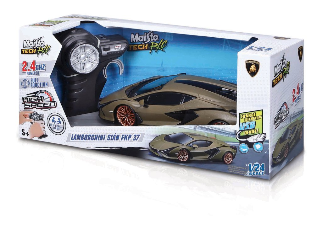 Lamborghini Sián FKP 37. Model sportovního vozu značky Maisto na dálkové ovládání. V měřítku 1:24. V autíčku je zabudovaná lithiová baterie, kterou lze dobíjet přes USB kabel. Ovladač obsahuje 2xAAA baterie (jsou součástí). Dosah ovládání až 35m. Doba nabíjení 45minut. Rozměry balení: 31,75x13,3x11,1cm. Věk: 5+