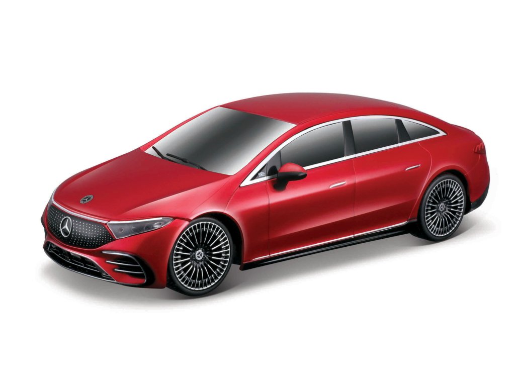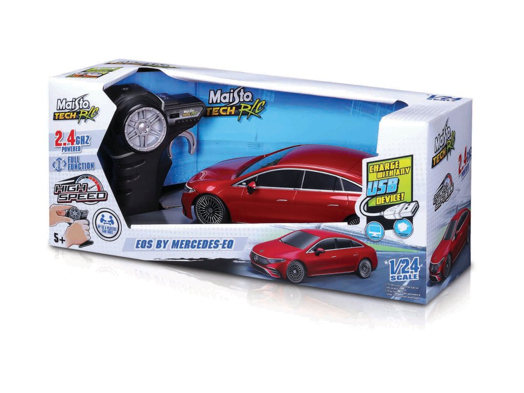 Mercedes-Benz EQS 1:24 RC Premium. Model sportovního vozu značky Maisto na dálkové ovládání. V autíčku je zabudovaná lithiová baterie, kterou lze dobíjet přes USB kabel (je součástí). Ovladač funguje na 2xAAA baterie (jsou součástí). 2,4 GHz – až 4 osoby. Pistolový ovladač. Dosah ovládání až 35 m. Doba nabíjení 45 minut. Rozměry balení: 13,3 x 31,75 x 11,1cm. Věk: 5+