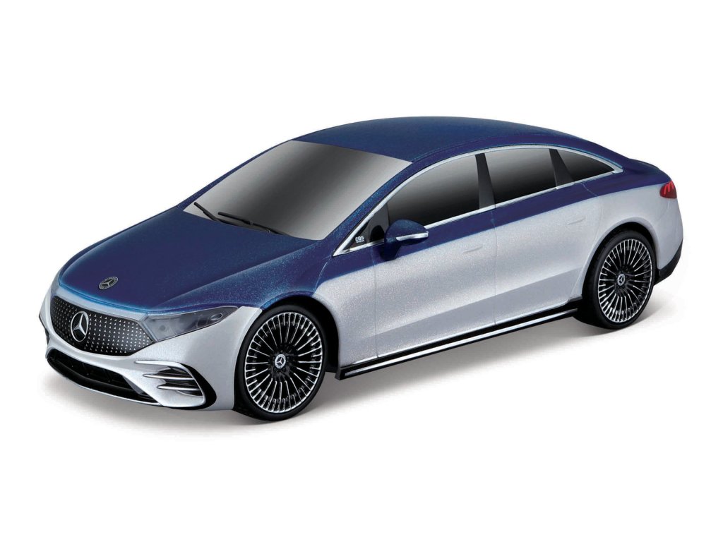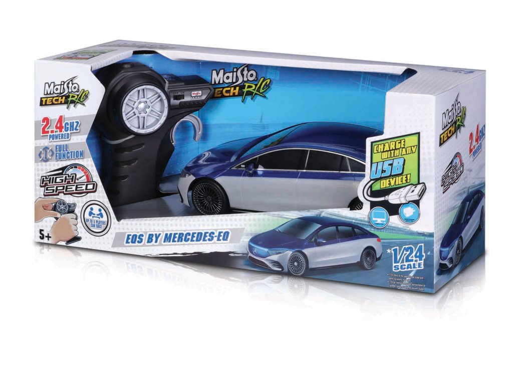 Mercedes-Benz EQS. Model sportovního vozu značky Maisto na dálkové ovládání. V měřítku 1:24. V autíčku je zabudovaná lithiová baterie, kterou lze dobíjet přes USB kabel. Ovladač obsahuje 2xAAA baterie (jsou součástí). Dosah ovládání až 35m. Doba nabíjení 45minut. Rozměry balení: 31,75x13,3x11,1cm. Věk: 5+