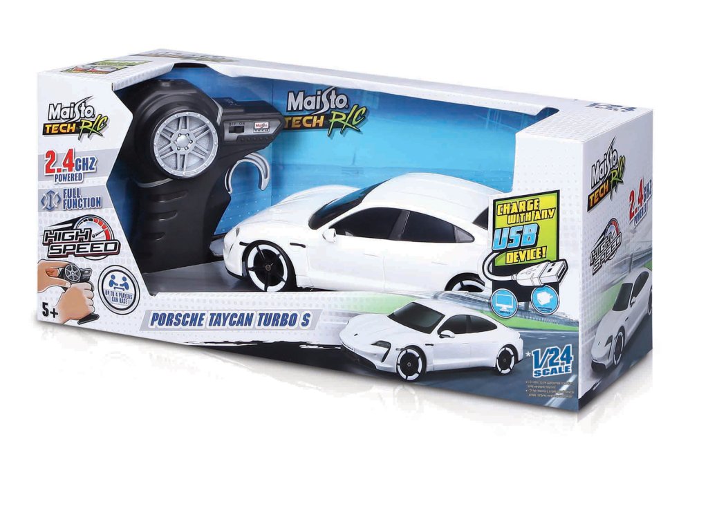 Porsche Taycan Turbo S. Model sportovního vozu značky Maisto na dálkové ovládání. V měřítku 1:24. V autíčku je zabudovaná lithiová baterie, kterou lze dobíjet přes USB kabel. Ovladač obsahuje 2xAAA baterie (jsou součástí). Dosah ovládání až 35m. Doba nabíjení 45minut. Rozměry balení: 31,75x13,3x11,1cm. Věk: 5+