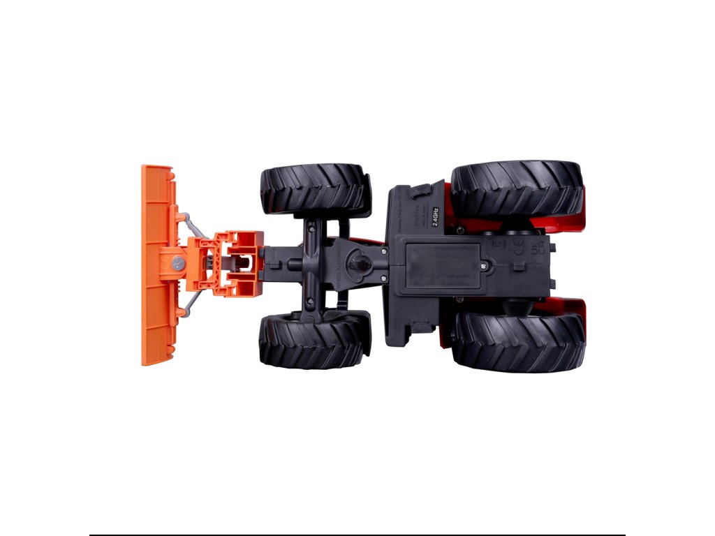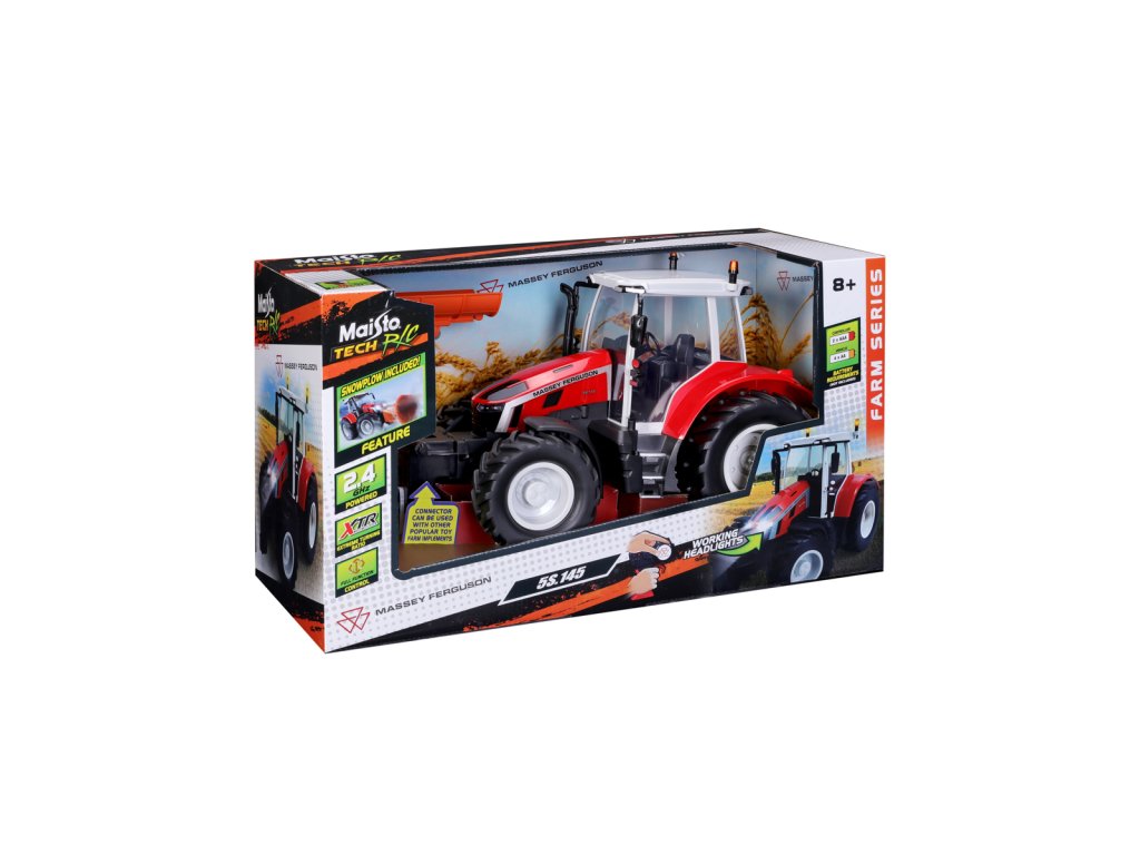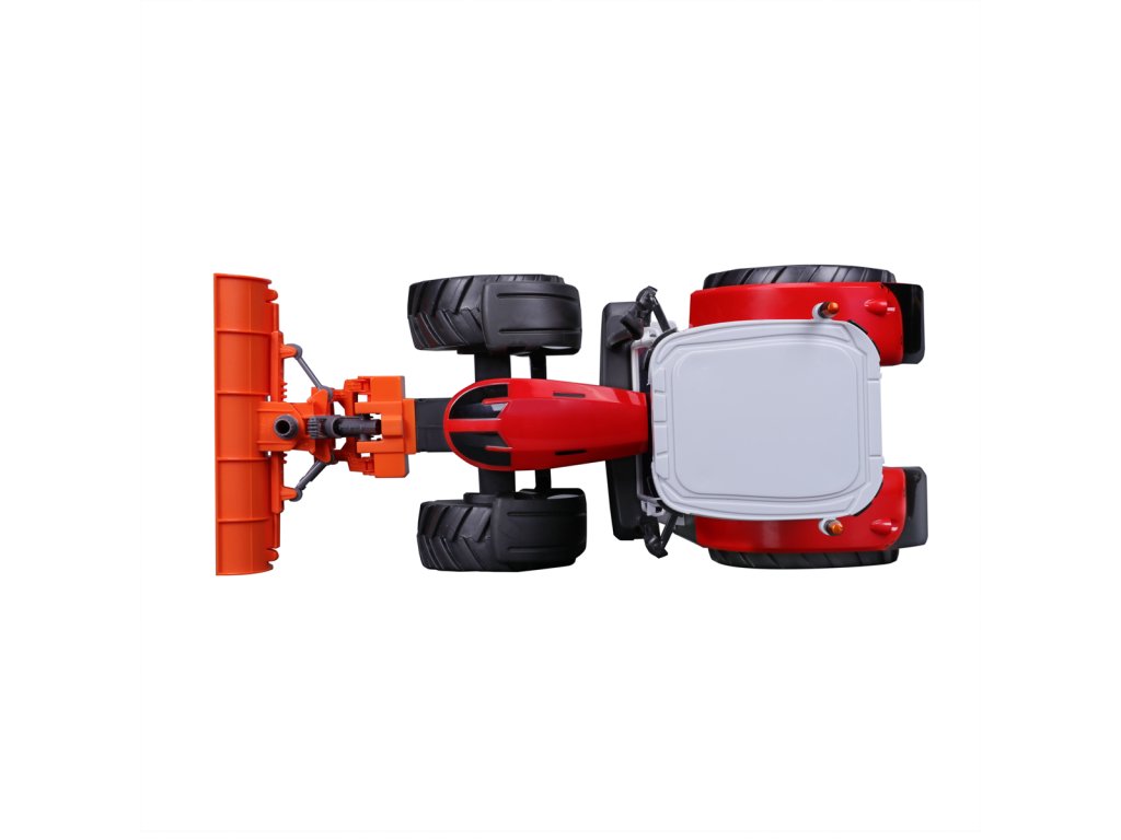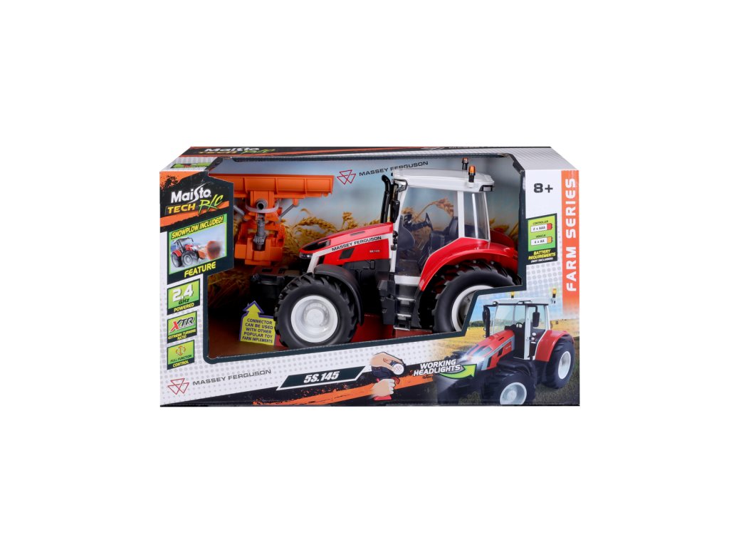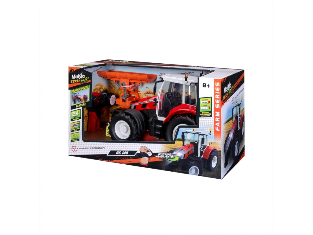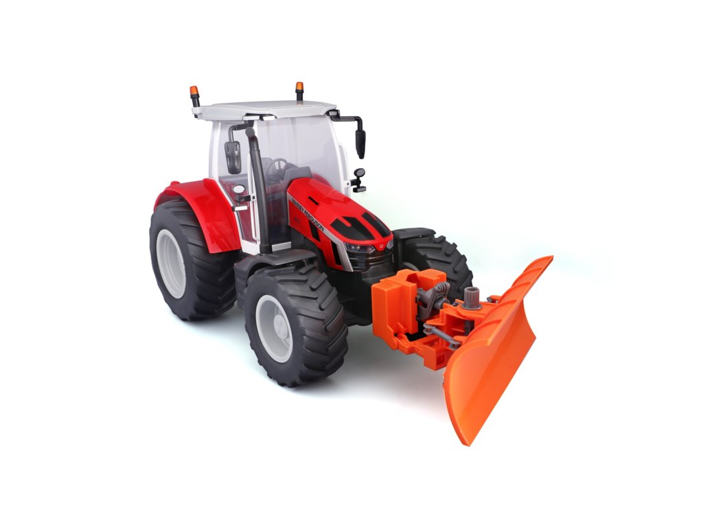 Traktor Massey Ferguson s radlicí a dálkovým ovládáním 2,4 GHz. Extrémní poměr otáčení, plně funkční ovládání, funkční světlomety. Pistolová rukojeť pro snadné ovládání. Přední a zadní konektory, řízení předních kol s detaily dezénu pneumatik. Přední radlice se dá natáčet ze strany na stranu. Měřítko 1:16. Vyžaduje 2 x AAA a 4 x AA baterie (nejsou součástí balení). Rozměr balení: 45x25x20cm. Věk: 3+