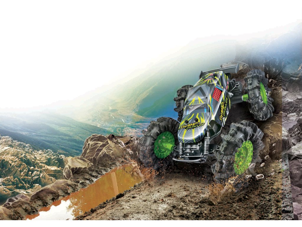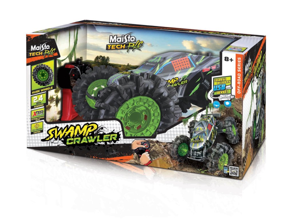 Swamp Crawler. Model terénního vozu na dálkové ovládání od značky Maisto. Auto využívá dobíjecí baterii, která se dobíjí pomocí USB kabelu (obojí součástí balení). Ovladač funguje na 2x AAA baterii. Dosah ovladače až 35m. Balení: 45,7x24,1x30,4cm. Věk: 8+