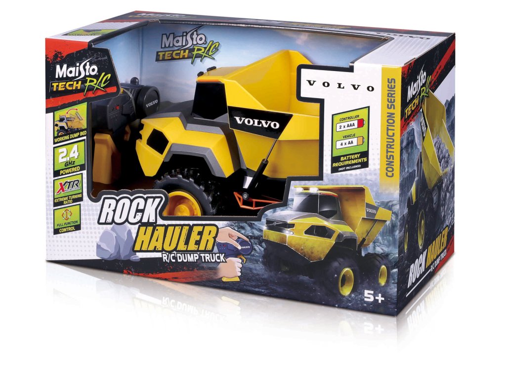 Volvo A25 Hauler. Model obrovského lomového nakladače na dálkové ovládání od značky Maisto. Korbu s nákladem lze pohodlně vyložit díky funkčnímu vyklápění. Auto potřebuje pro svůj provoz 4xAA baterii (nejsou součástí). Ovladač funguje na 2x AAA baterii(nejsou součástí). Dosah ovladače až 35m. Balení: 41,3x25,4x20,3cm. Věk: 5+