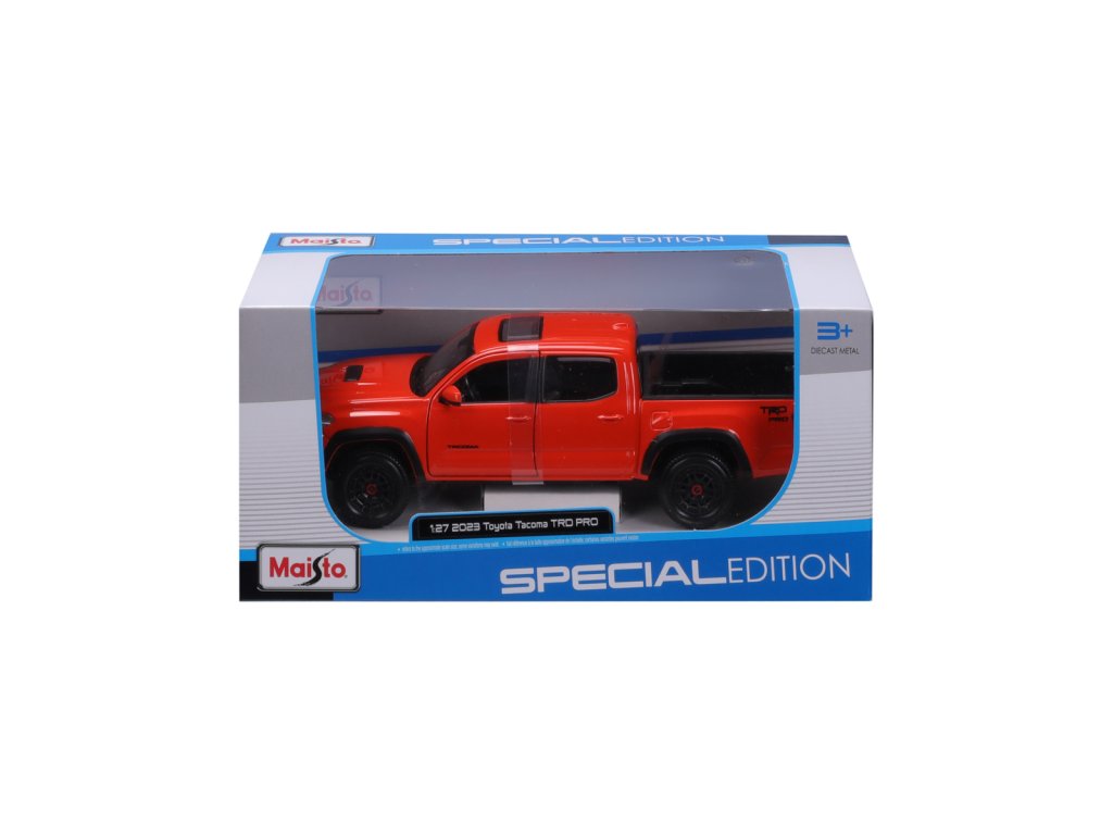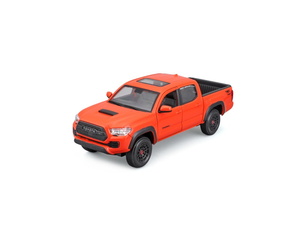 Toyota Tacoma TRD Pro v měřitku 1:27 v oranžové barvě. Model má otevírací dveře. Kovový model s plastovými díly. Rozměr balení: 23,3x10,5x11,4 cm. Věk 3+