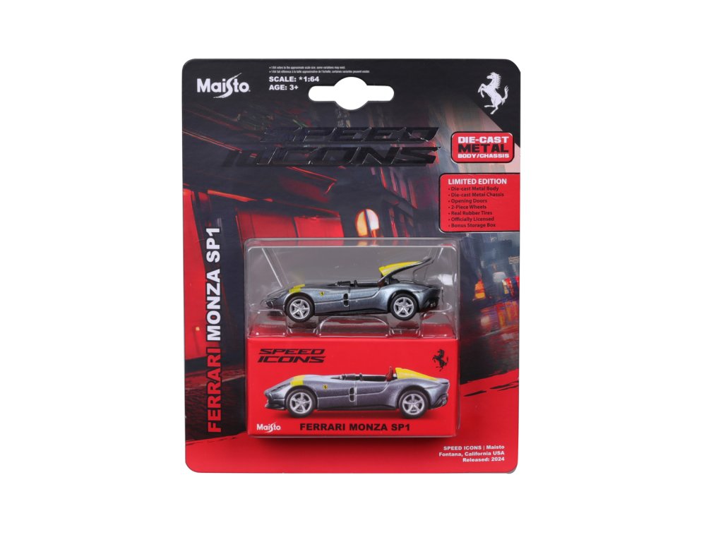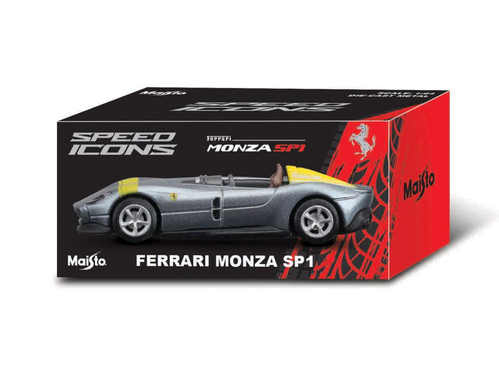 Speed Icons 1:64 Ferrari Monza SP1 stříbrno-žluté. Modely Speed Icons jsou sbírkou těch nejzajímavějších, nejúžasnějších a nejvýkonnějších vozidel, která svět nabízí. Od super vozů za vysoké ceny až po nejšílenější, nadmíru výkonná moderní auta. Nová úroveň designu a pozornost věnovaná detailům jako žádná jiná. Karoserie i podvozek jsou vyrobeny z litého kovu. Model v měřítku 1:64 má otevírací dveře kufru, dvoudílná kola s odpružením a pneumatikami ze skutečné pryže. Baleno v prémiovém úložném boxu. Nevhodné pro děti do 3 let. Rozměry balení: 17,8 x 14 x 5 cm. Doporučený věk 8 +