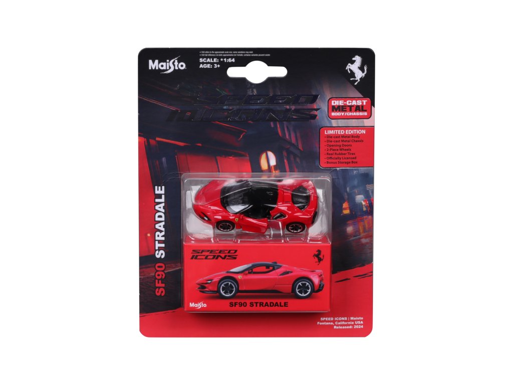 Speed Icons 1:64 Ferrari SF90 Stradale červeno-černé. Modely Speed Icons jsou sbírkou těch nejzajímavějších, nejúžasnějších a nejvýkonnějších vozidel, která svět nabízí. Od super vozů za vysoké ceny až po nejšílenější, nadmíru výkonná moderní auta. Nová úroveň designu a pozornost věnovaná detailům jako žádná jiná. Karoserie i podvozek jsou vyrobeny z litého kovu. Model v měřítku 1:64 má otevírací dveře, dvoudílná kola s odpružením a pneumatikami ze skutečné pryže. Baleno v prémiovém úložném boxu. Nevhodné pro děti do 3 let. Rozměry balení: 17,8 x 14 x 5 cm. Doporučený věk 8 +