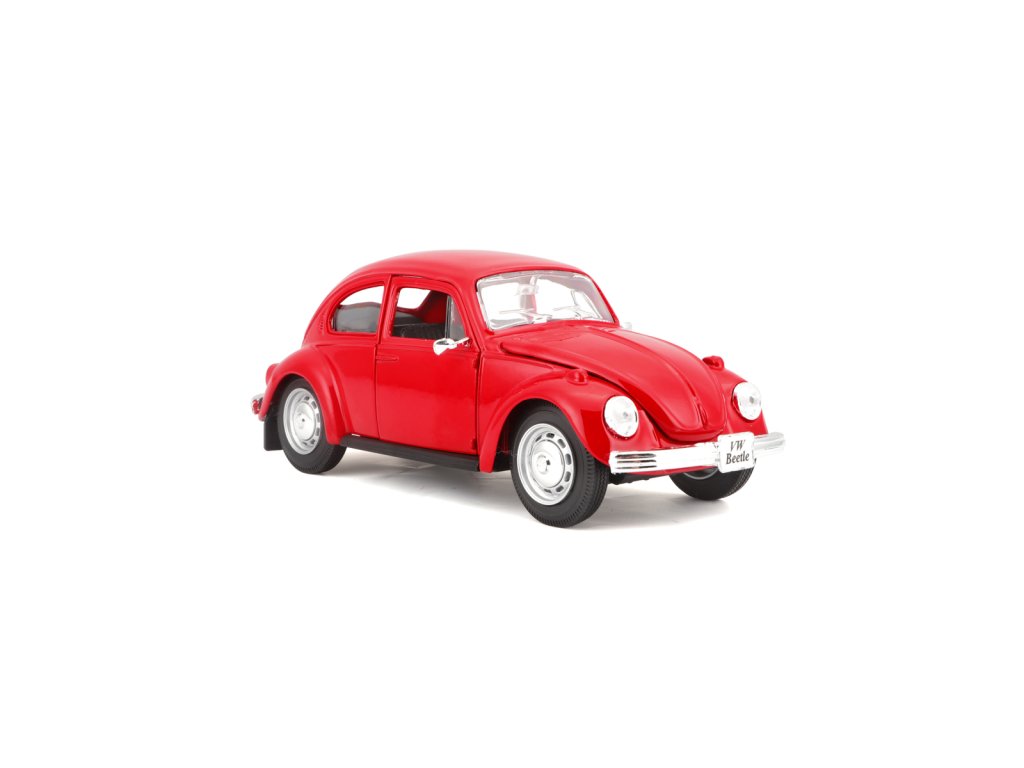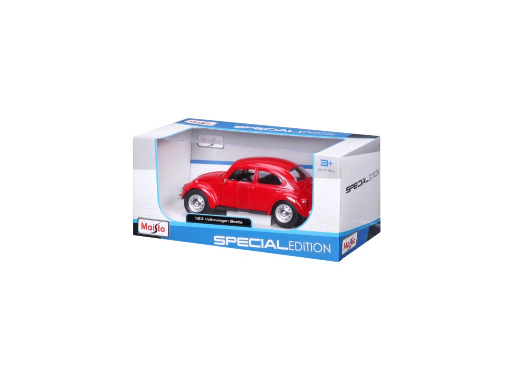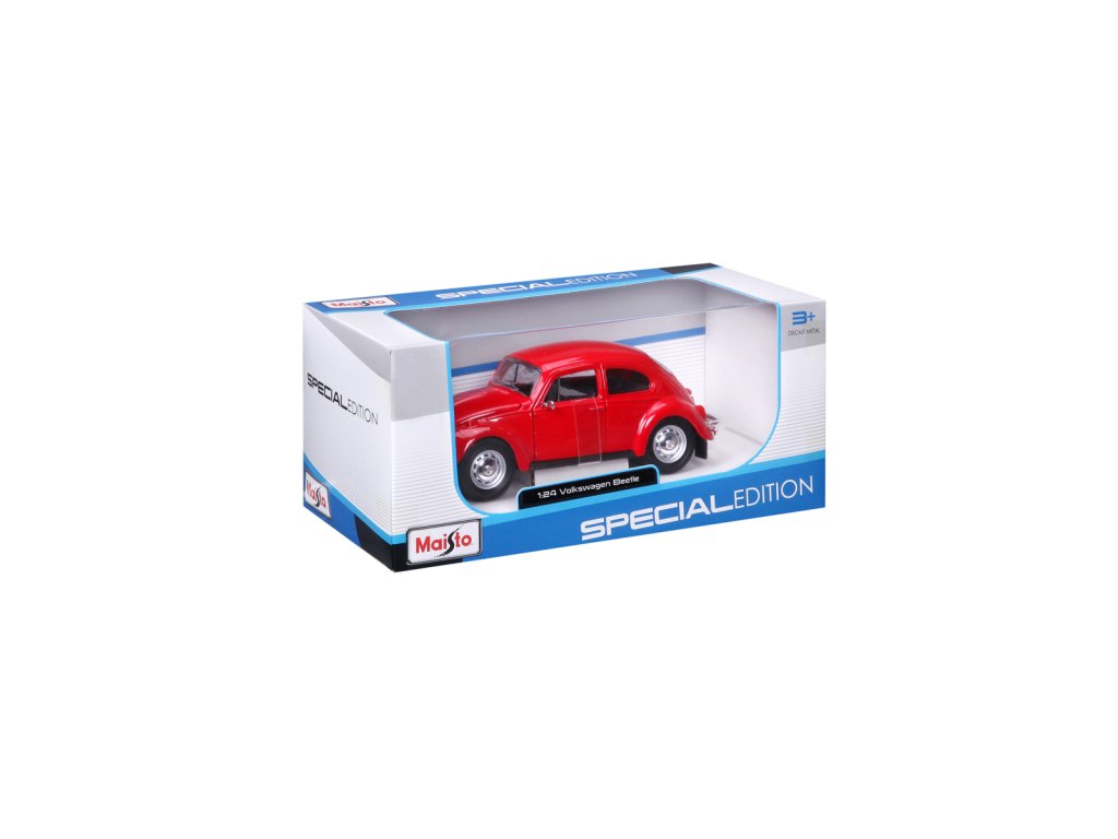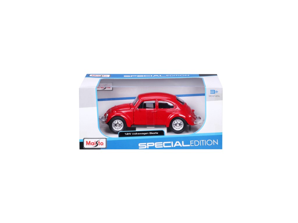 Volkswagen Beetle, červená. Kovové modely Maisto v měřítku 1:24 patří mezi nejoblíbenější. Mají velmi dokonalé detailní provedení jednotlivých částí a kvalitní barevné provedení. Má otevíratelnou přední kapotu a přední dveře. Baleno v krabičce. Nevhodné pro děti do 3let. Rozměry balení: 22,8x10,5x11,4cm. Věk: 3+