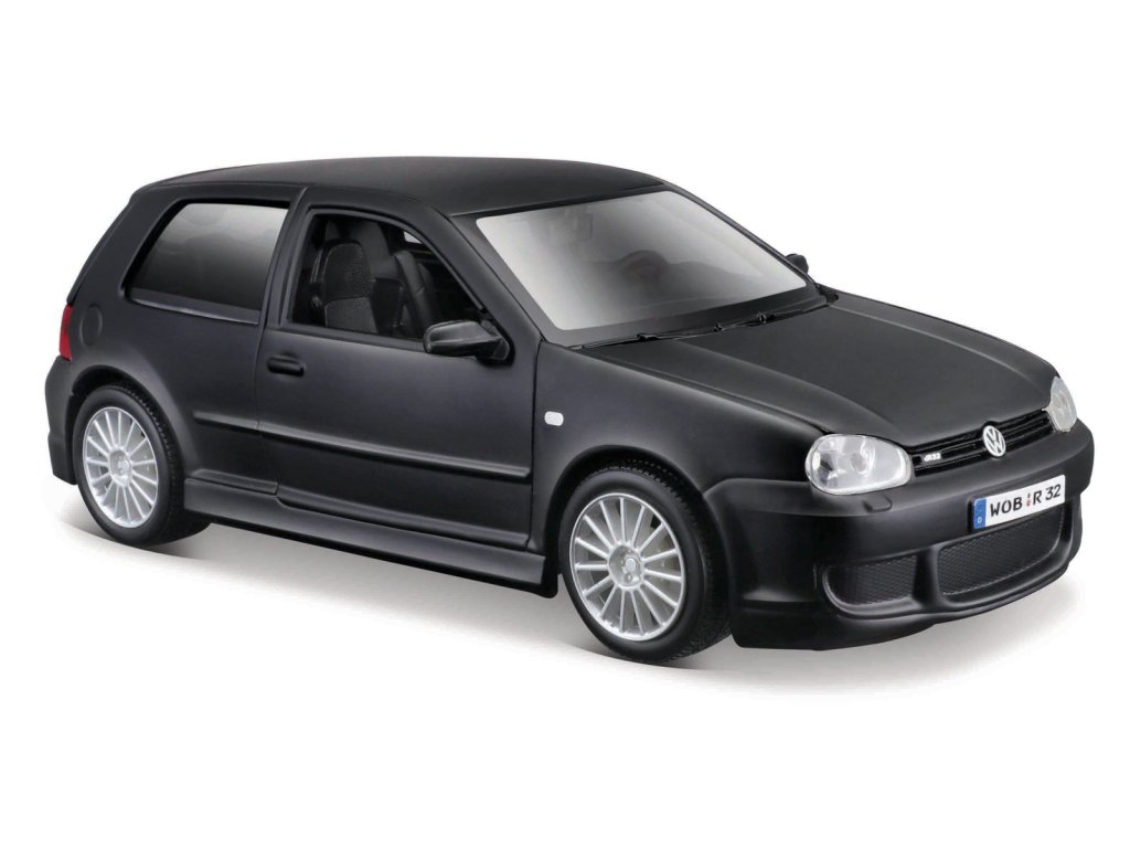 Volkswagen Golf R32, matně černá. Kovové modely Maisto v měřítku 1:24 patří mezi nejoblíbenější. Mají velmi dokonalé detailní provedení jednotlivých částí a kvalitní barevné provedení. Má otevíratelnou přední kapotu a přední dveře. Baleno v krabičce. Nevhodné pro děti do 3let. Rozměry balení: 22,8x10,5x11,4cm. Věk: 3+