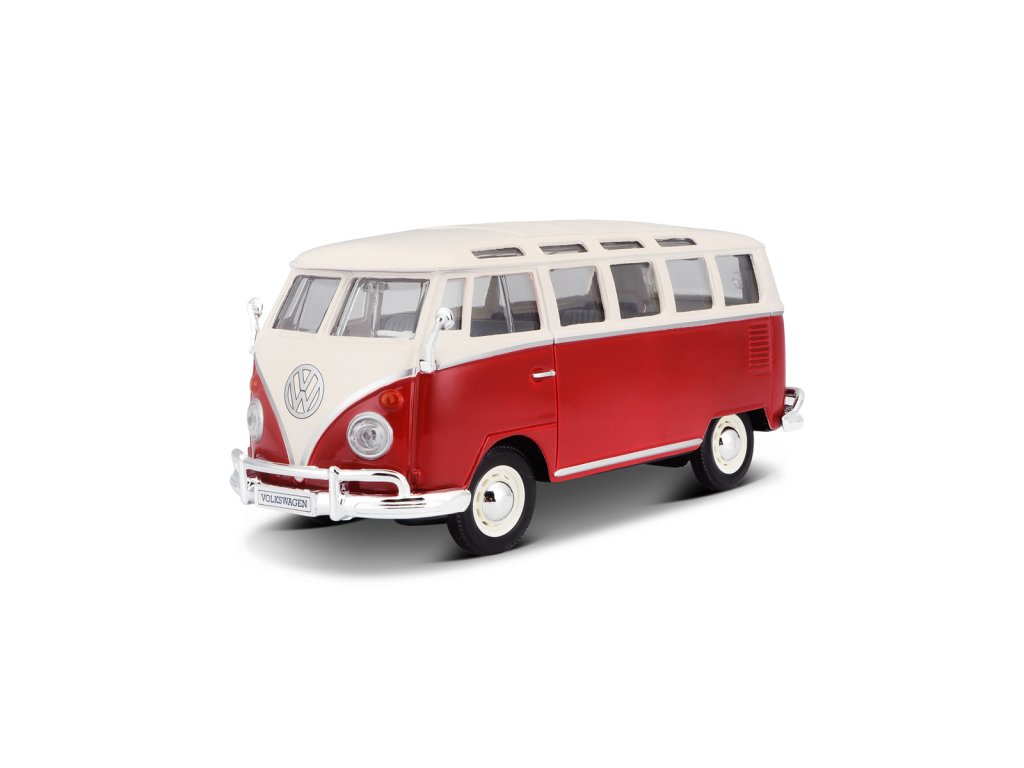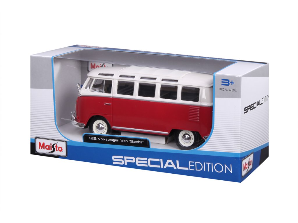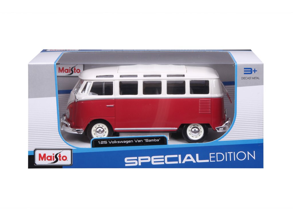 Volkswagen Van Samba, Bílo/červená. Kovové modely Maisto v měřítku 1:25 patří mezi nejoblíbenější. Mají velmi dokonalé detailní provedení jednotlivých částí a kvalitní barevné provedení. Má otevíratelnou přední kapotu a přední dveře. Baleno v krabičce. Nevhodné pro děti do 3let. Rozměry balení: 22,8x10,5x11,4cm. Věk: 3+
